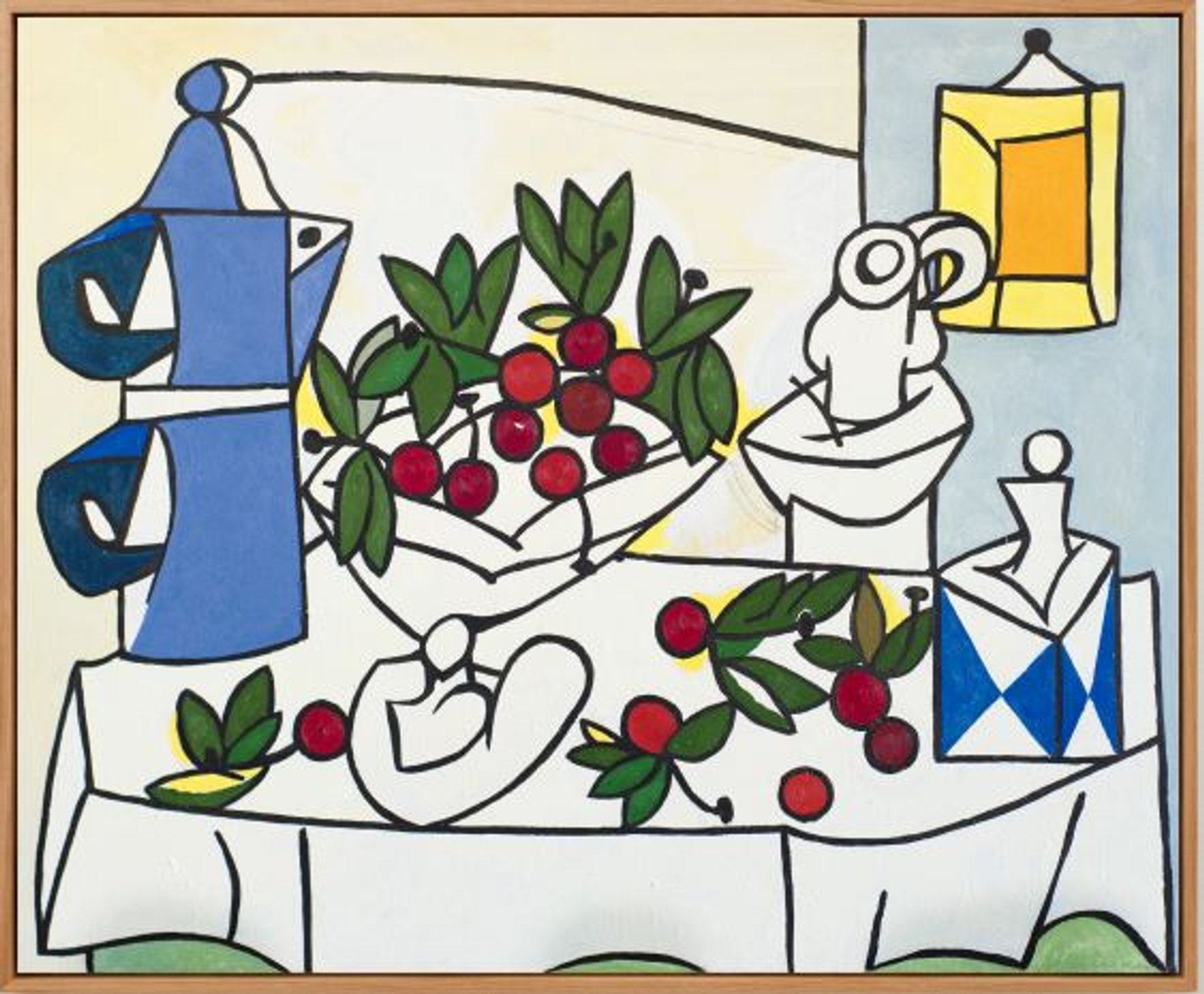 Eliza Pepermans, Cherries and coffee pot, 2022, huile sur toile. © Eliza Pepermans et Schönfeld Gallery