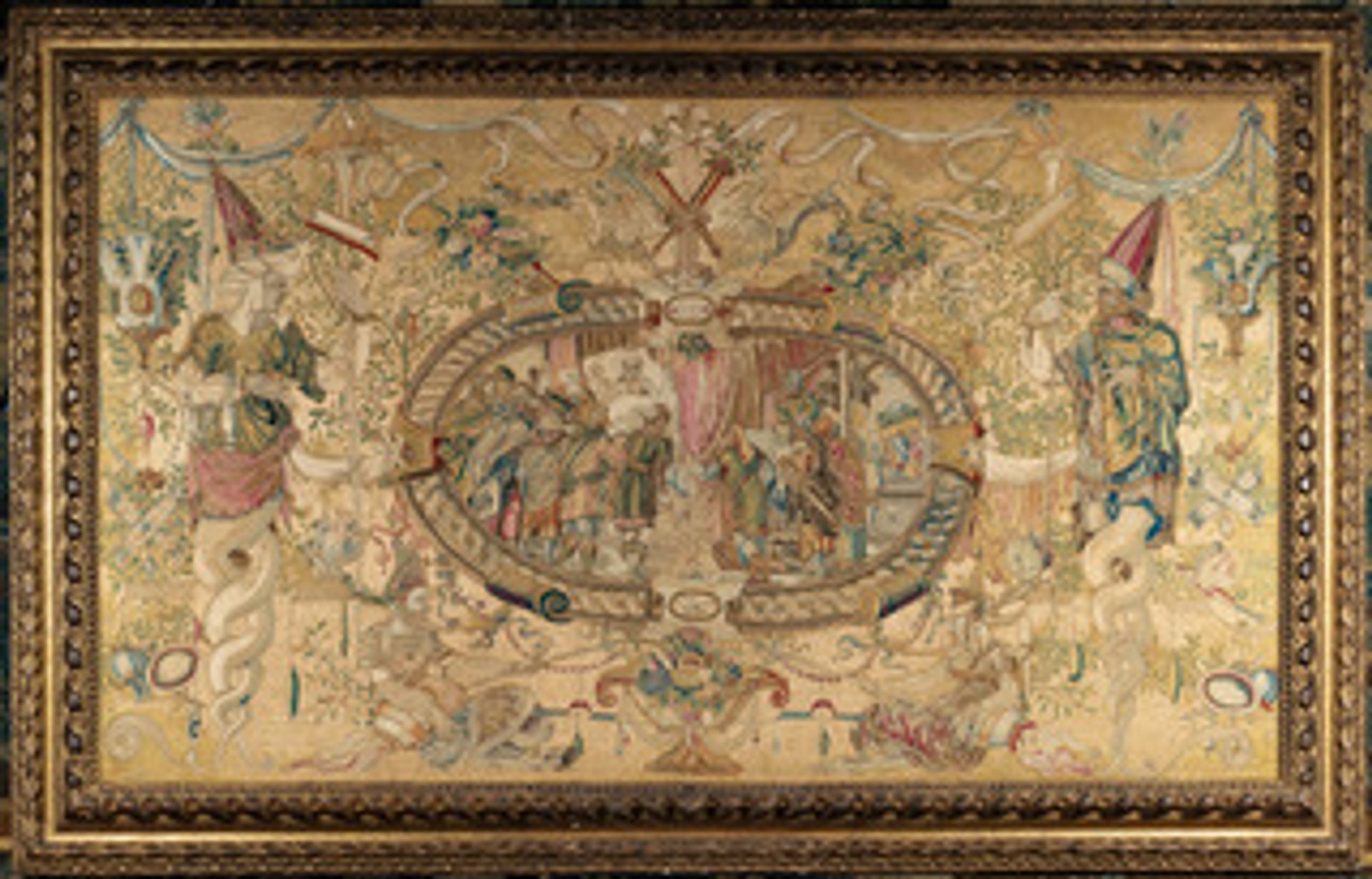 École française, Jacob et ses enfants, 1566, broderie de fil de soie, laine et filets métallique sur taffetas de soie. Courtesy Galerie Trebosc et van Lelyveld
