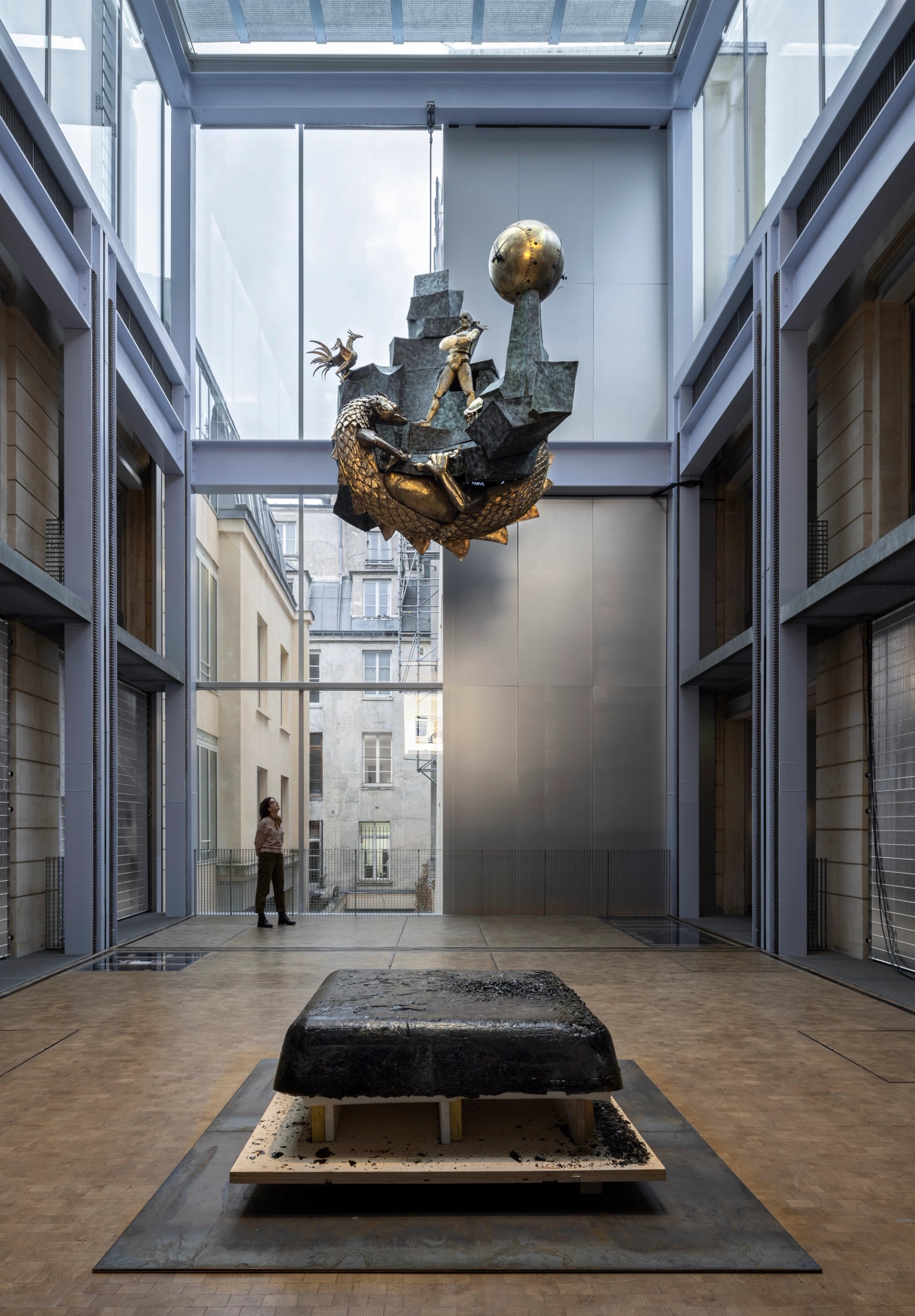 Vue de l’exposition « HUMPTY\DUMPTY », Lafayette Anticipations, Paris, 2022 : en haut, Jacques Monestier, Le Défenseur du temps, 1979, sculpture ; en bas, Cyprien Gaillard, Palais de la découverte vitrifié, 2022, amiante vitrifiée. © Cyprien Gaillard et Lafayette Anticipations.