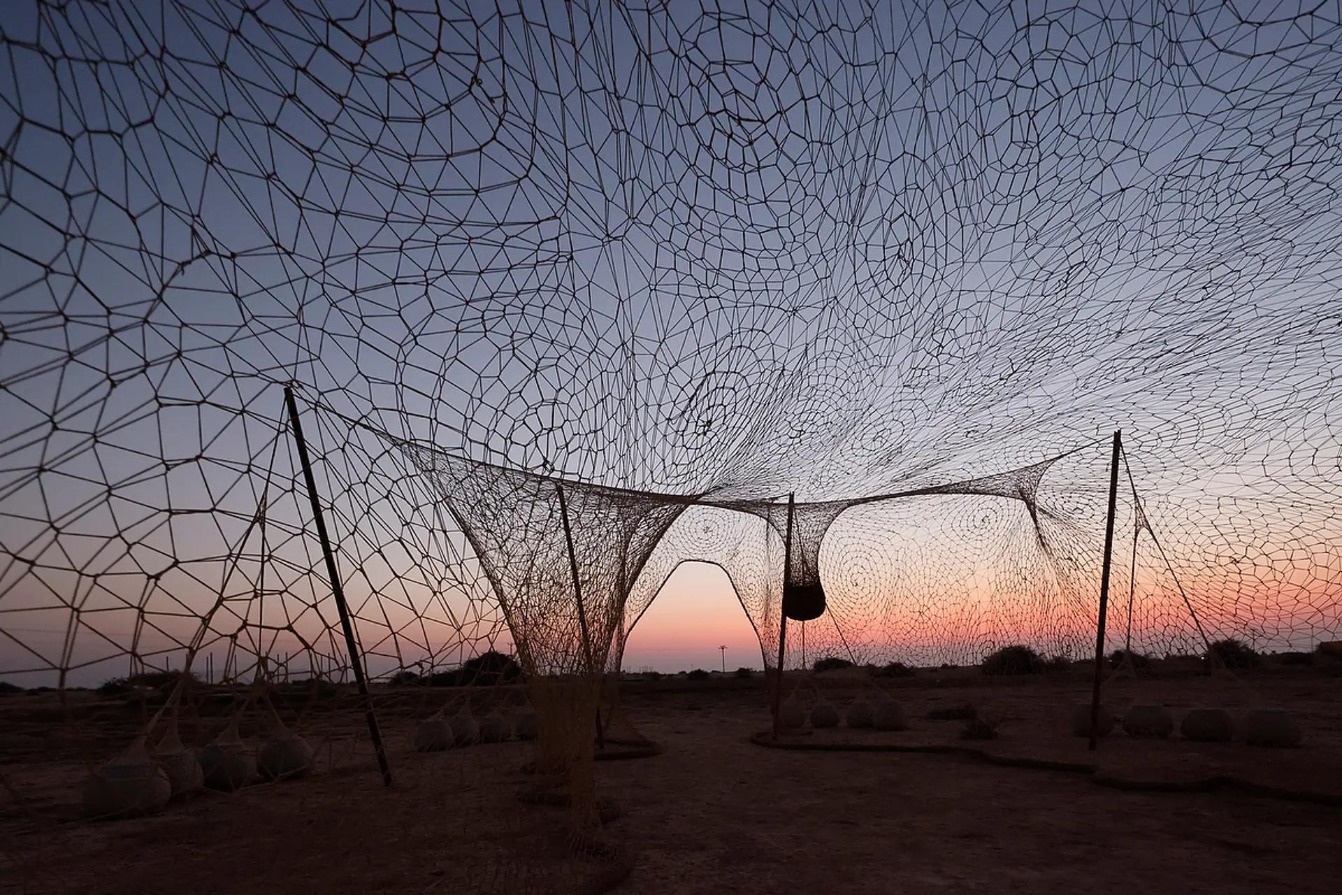 L’environnement en filet de l’artiste brésilien Ernesto Neto, également situé dans le désert au nord du pays, invite les visiteurs à entrer à l’intérieur d’un but de football octogonal disposant d’une sphère en céramique en son centre. Ouverte aux éléments, la pièce est conçue comme un lieu de méditation et de communion : entre les êtres humains et le désert et entre des personnes issues de différentes cultures.