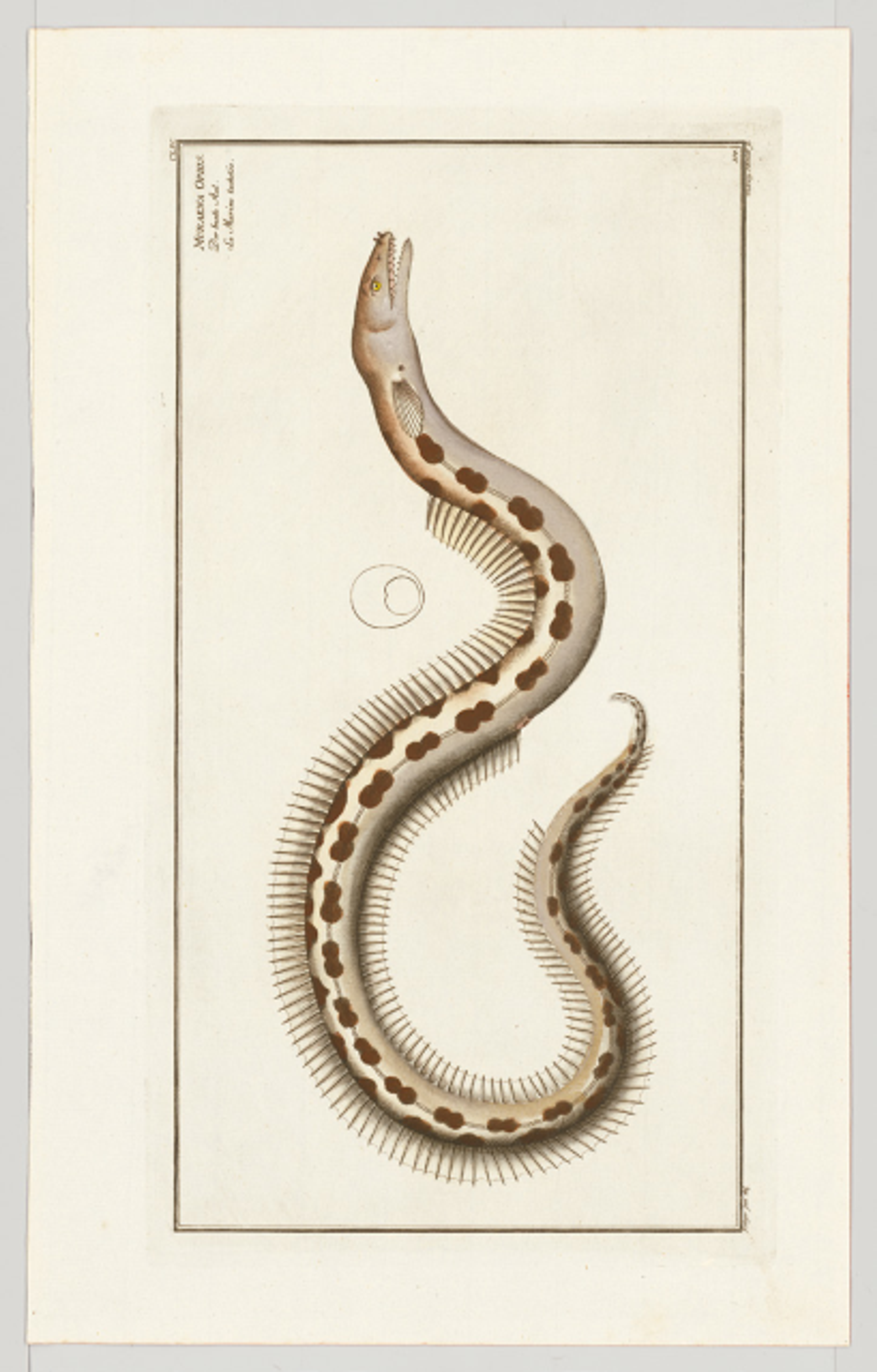 Anri Sala, Untitled (Muraena Ophis/England), 2018 : page de manuscrit historique avec gravure colorée à la main. © Anri Sala. Courtesy des galeries Esther Schipper, Berlin, et kurimanzutto, Mexico