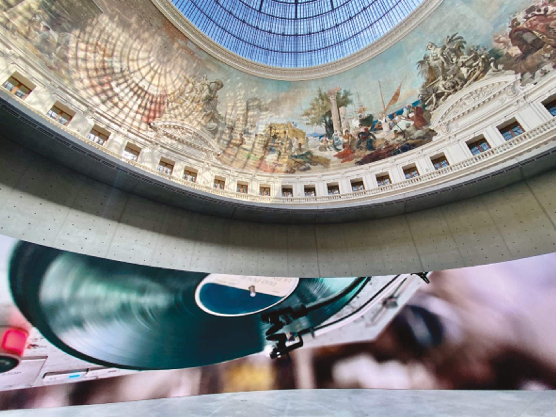 Les formes et les trajectoires des planètes ont un lien fort avec la musique. Il y a eu des envies, depuis l’Antiquité, de voir des relations entre le Cosmos et les tonalités de la musique. Dans la rotonde, ce qui m’importait était de légèrement décentrer cette forme du cercle, non pas pour aller contre ce cercle – j’y apporte d’autres courbes, notamment avec les écrans en arc de cercle –, mais pour produire les fréquences basses de l’émotion, celles que l’on sent dans l’estomac. Dans Time No Longer, on voit une platine tourner comme en apesanteur dans la cabine fermée d’une station spatiale. Le travail fait avec le son – et la lumière –, qui est naturellement plus présent de nuit que de jour, accompagne les révolutions du tourne-disque. Cela produit des moments d’harmonie, mais également de syncope entre le tourne-disque en mouvement et la coupole, qui tourne elle aussi, selon une autre temporalité, avec les mouvements du soleil, et qui fait le tour de la fresque comme une demi-platine. Je veux déstabiliser le côté posé du cercle. Il y a beaucoup de volonté dans cette harmonie, ce qui signifie qu’elle n’est pas naturelle. En se mettant au centre de la rotonde, on peut jouer avec cela.