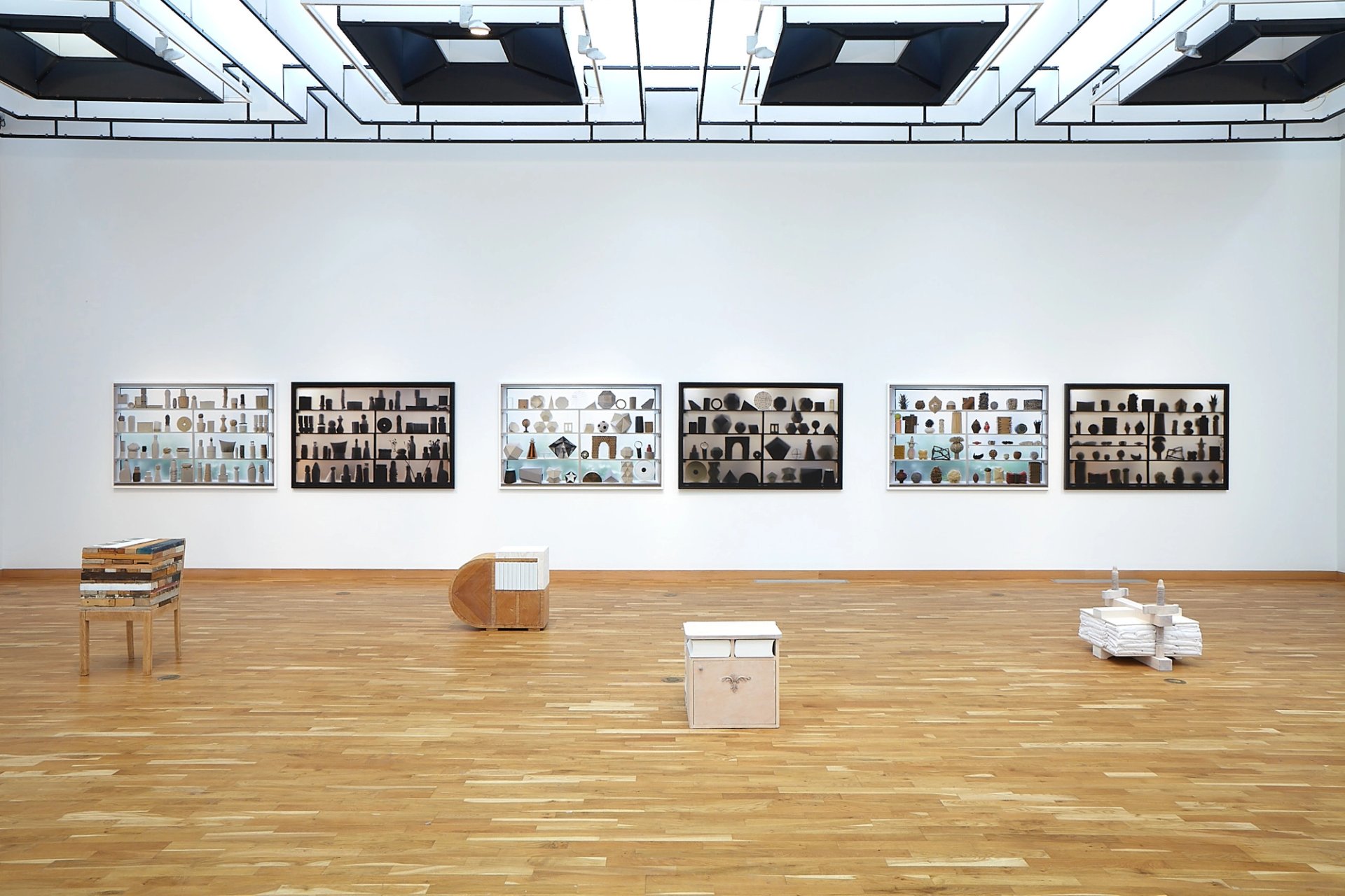 Cette notion de présence/absence se décline allègrement en des concepts voisins, tel que plein/vide ou surface/contenant. Ainsi, cette collection de petits « meubles » (Sans titre) également conçus avec des pièces récupérées, auxquelles l’artiste a ajouté une forme complémentaire qui comble ou matérialise un vide, comme pour parachever une histoire interrompue en cours de route, façon cadavre exquis. Parfois même, une peinture rose chair vient renforcer l’effet tactile.