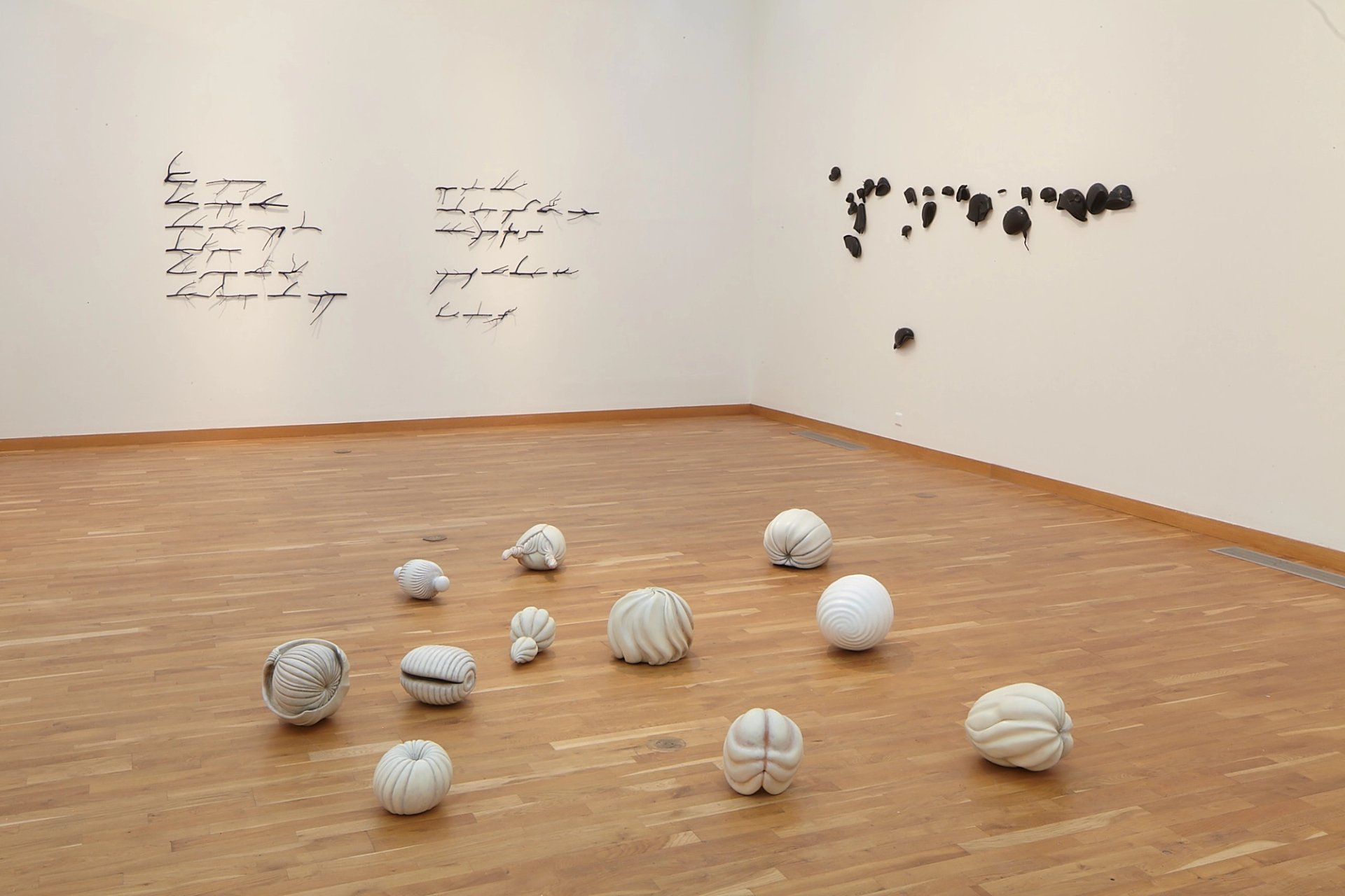 L’autre pan important du travail de Gudjon Ketilsson est celui autour du langage. Les objets, signes ou symboles qu’il accumule en permanence semblent, peu à peu, dessiner une cohérence, du sens, presque une langue. Il a ainsi façonné une centaine d’outils – la main, donc le corps, encore… – qu’on imaginerait dévolus à divers artisanats, mais qui, lorsqu’on les regarde de plus près, se révèlent parfaitement inutiles, telle une famille d’objets surréalistes (Outils). De ses pérégrinations à pied, Ketilsson récupère de nombreux items cassés qui, une fois fixés sur la cimaise comme sur une portée (À mi-chemin), esquissent une petite musique ou une écriture ne demandant qu’à être déchiffrées.