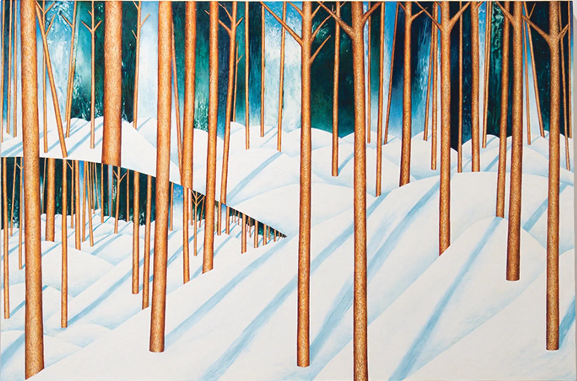 Basé en Arizona, Jason Saager crée des paysages qui se situent « quelque part entre la peinture de la Renaissance, avec ses perspectives déformées, et le surréalisme, avec ses étranges inventions, explique Julie Senden, la directrice de la galerie Rodolphe Janssen, basée à Bruxelles. [Ces troncs] ont l’air assez lisses de loin, mais si vous vous approchez, il y a tellement de matière en eux ». L’œuvre a été vendue aux alentours de 20 000 dollars à un collectionneur américain.