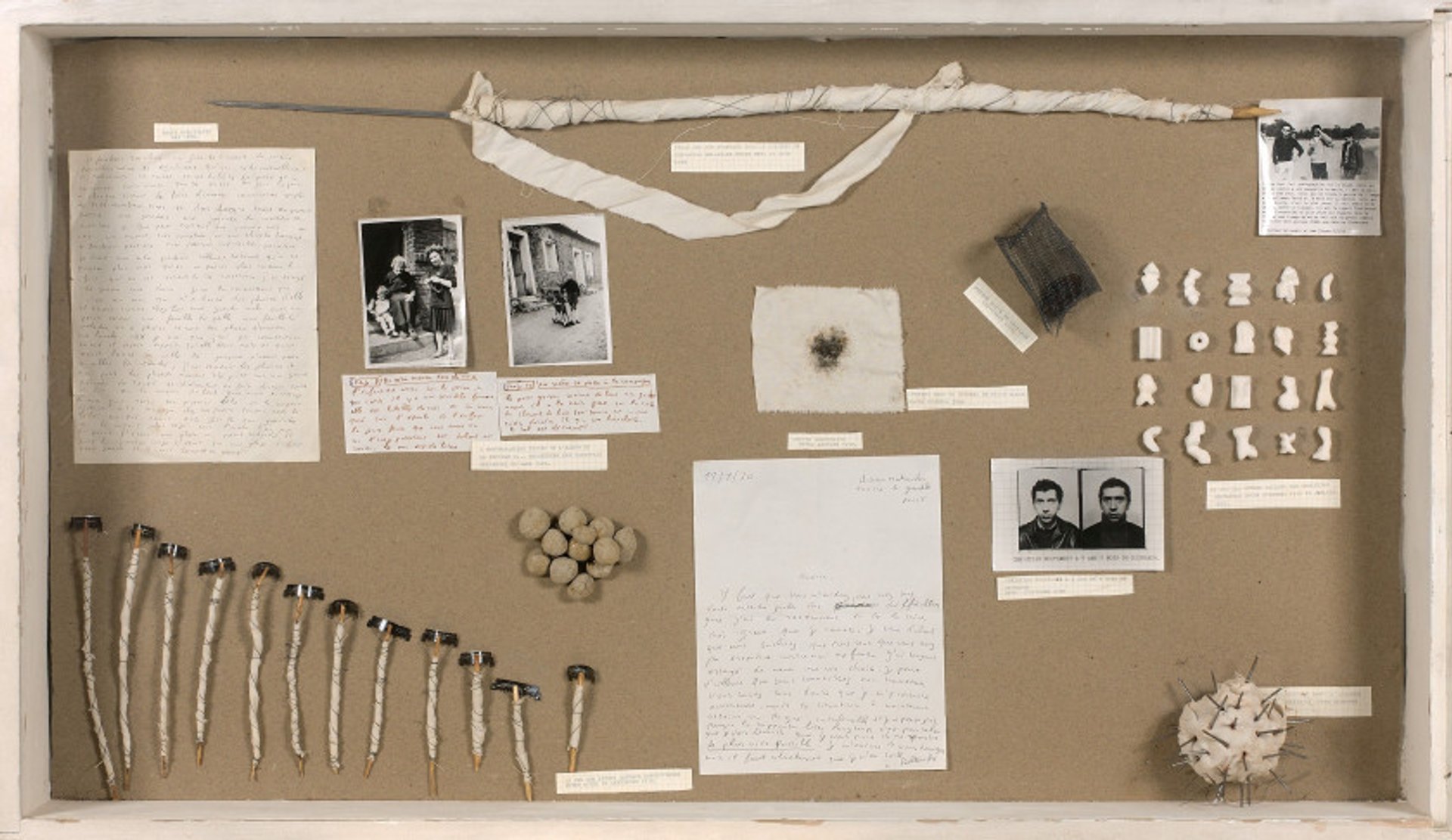Christian Boltanski, Vitrine de référence, 1972, photographies noir et blanc, sucre, cailloux, cheveux, tissus, métal, fil de fer, clous, lames de rasoir, bois, papier, encre et plexiglas dans un emboîtage en bois peint, 70 x 120,50 x 10 cm. Courtesy Artcurial
