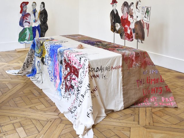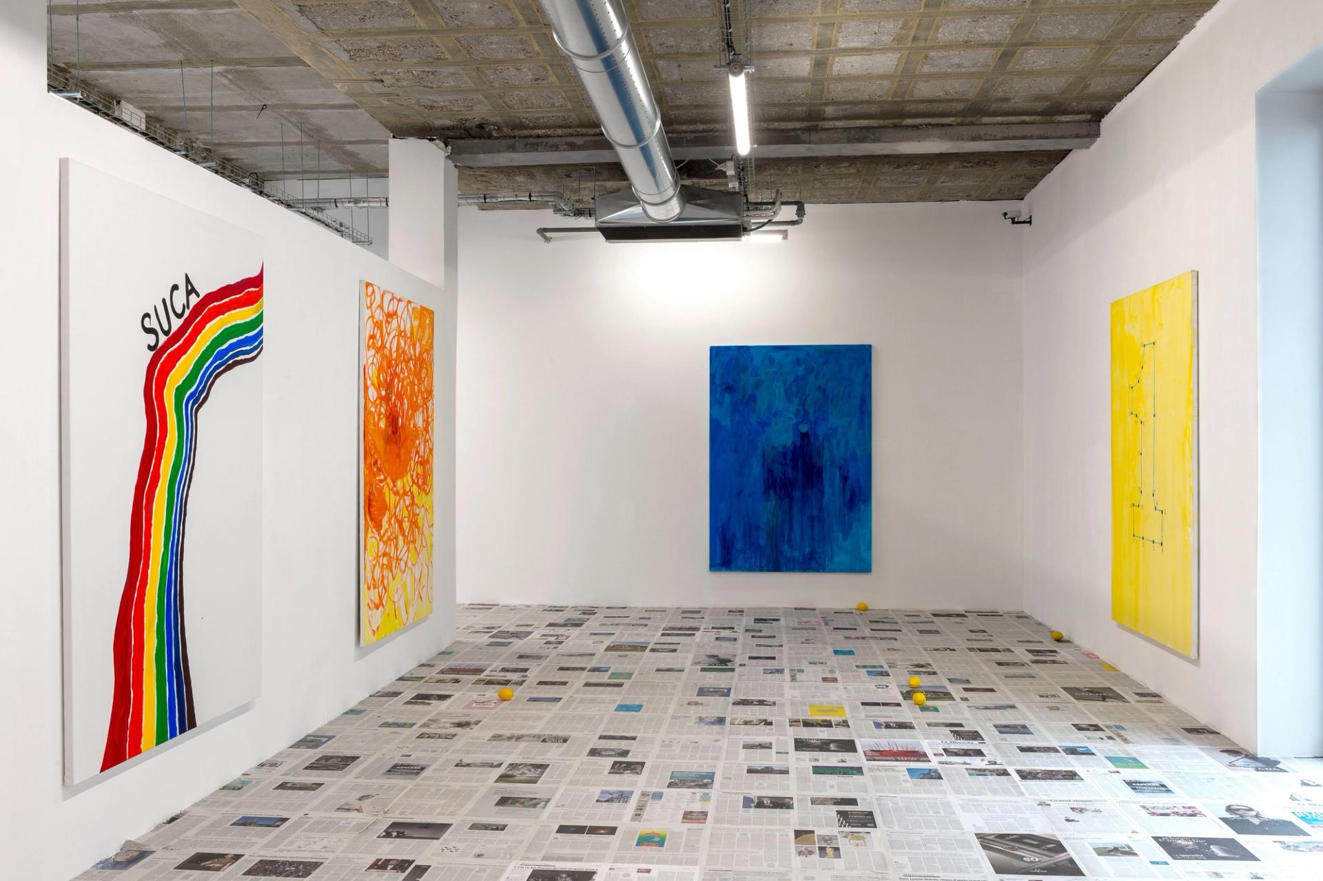 Claire Fontaine est un nom qu’on associe à des ready-made et à des phrases bien choisies, généralement en néon. Cette nouvelle exposition présente essentiellement des tableaux. Une façon de prendre acte de cette bonne santé de la peinture, déjà lieu commun ? Les tableaux ici relèvent de différents registres, certains qui semblent d’une honnête et banale abstraction (mais chargés d’intentions par leurs titres : Lockdown Party, Lawmakers & Lawbreakers), d’autres qui relèvent d’un usage très libre des sources visuelles : une carte de Paris où figure l’évolution des prix au mètre carré par arrondissement, ou bien encore la célèbre image de 1968 du poing qui surgit d’une cheminée, ici dans un paysage incandescent. Le sol est entièrement couvert de pages de journaux, comme un rappel de l’arte povera, avec, déposés çà et là, de faux citrons (Migrants) dont on peut faire une lecture allégorique. Du grave (particulièrement dans les textes), de l’ironie, à l’évidence, mais aussi une mélancolie que l’on pourrait dire « debordienne ».