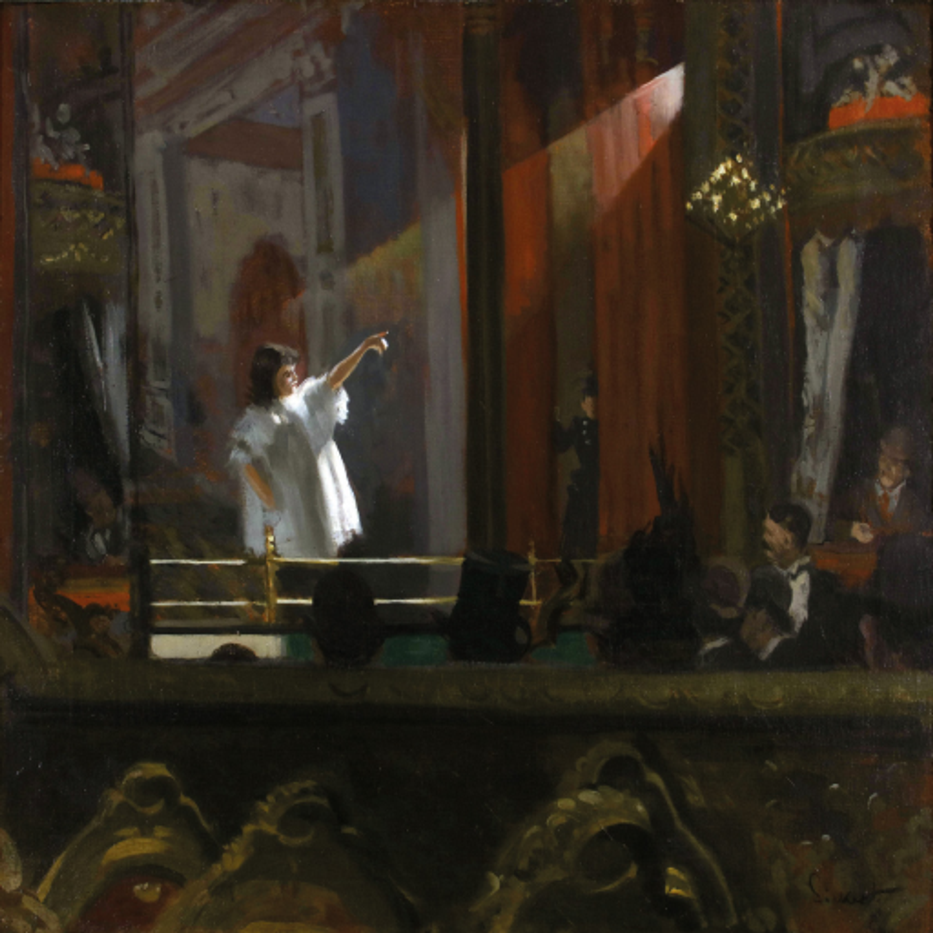On s’arrête devant ses devantures de magasins, avec leur frontalité et leur structuration, mais aussi leur transparence et la profondeur qui peut les creuser, les amorces de narration qu’y impriment certaines figures, certains détails ou encore la lumière vive qui, en les frappant, les décolle du reste des façades (The Red Shop, vers 1888). On vibre devant ses salles de music-hall, The Old Mogul ou The Old Bedford, immortalisées à l’heure de leur déclin, avec les nombreux jeux de perspectives qu’elles permettent, l’animation qui y règne pendant le spectacle, en particulier au poulailler où l’on se serre (Noctes Ambrosianae, 1906). On observe les échanges qui s’y déploient, entre le pouvoir qu’exerce sur la salle ce qui se déroule sur scène (The P.S. Wings in the O.P. Mirror, vers 1888-1889) et le brassage des classes sociales s’opérant au sein du public, dans la proximité que produit le partage des émotions.