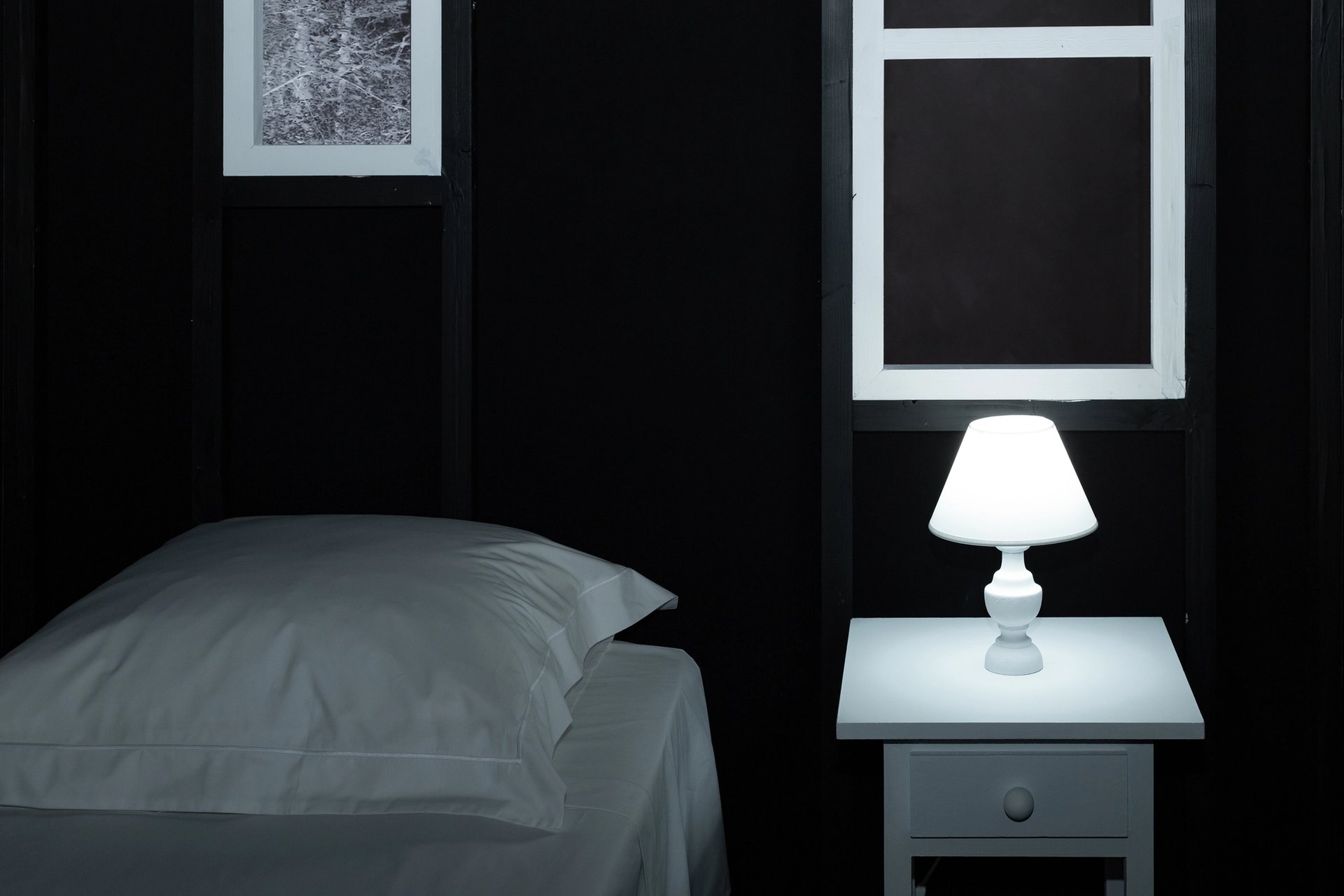 A contrario, dans l’« espace muséographique », la nature, en l’occurrence une forêt représentée à la nuit tombée, n’est plus contenue par l’architecture, mais la cerne de ses monumentales frondaisons. Le titre de l’exposition sied davantage à ce second volet. « La Maison lointaine » de Martine Aballéa est, en l’occurrence, une petite cabane faite de toile de feutre noir tendu sur une structure en bois. De nombreuses fenêtres trouent les façades latérales, et deux porches la flanquent de part et d’autre. L’ensemble des éléments qui la compose est surligné par des « traits lumineux » faits de LED. L’accès en est, certes, physiquement prohibé, mais en penchant sa tête vers l’intérieur, on distingue un mobilier tout blanc et tout ce qu’il y a de plus spartiate : un lit, une table de nuit et une lampe de chevet, allumée. On pense immédiatement à Henry David Thoreau (Walden ou la Vie dans les bois), voire à Virginia Woolf et à son « refuge d’écriture » planté au fond de son jardin du Sussex (Grande-Bretagne).