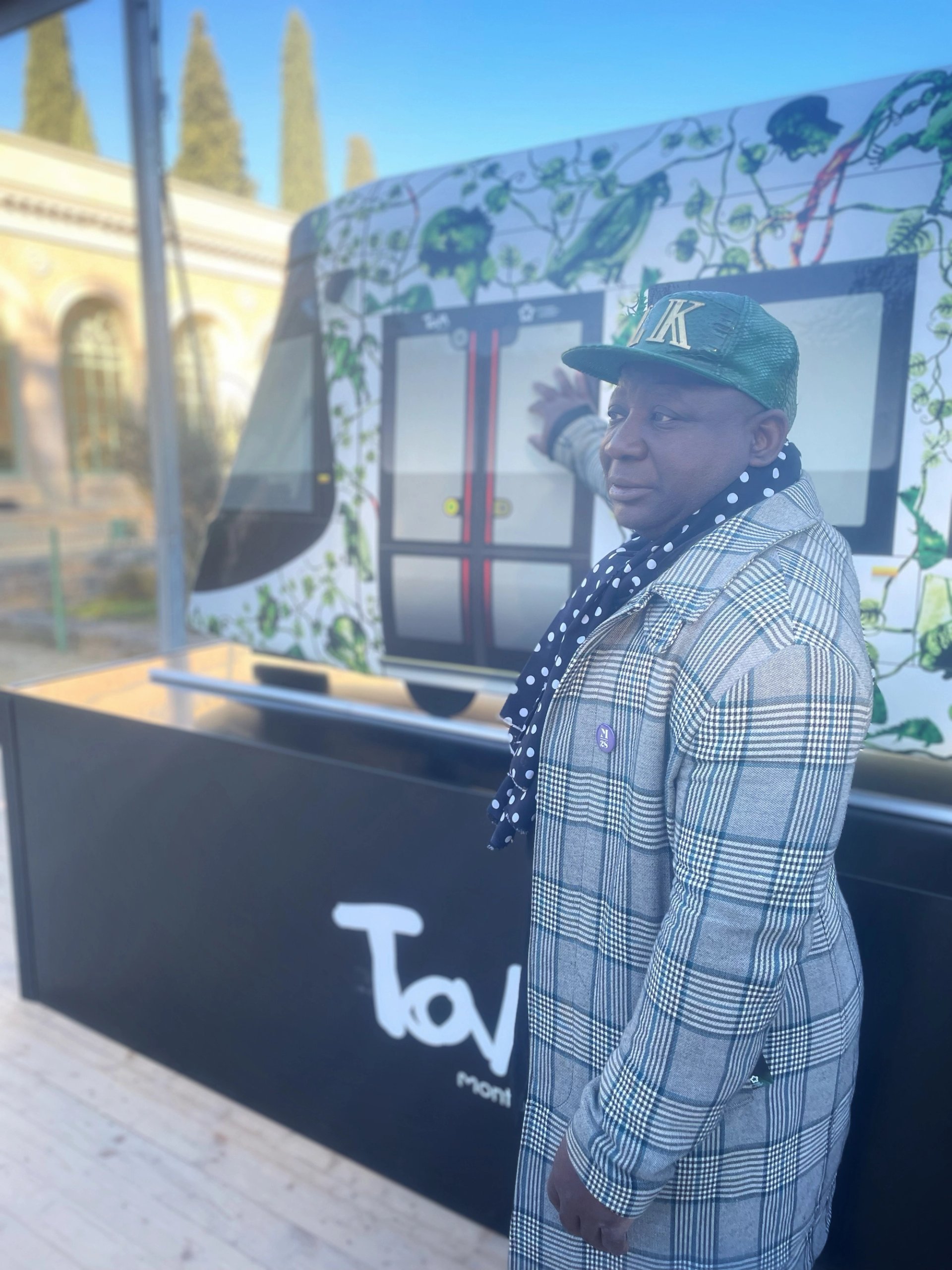 Barthélémy Toguo au jardin des Plantes à Montpellier devant son projet pour la ligne 5 du Tramway de la ville.