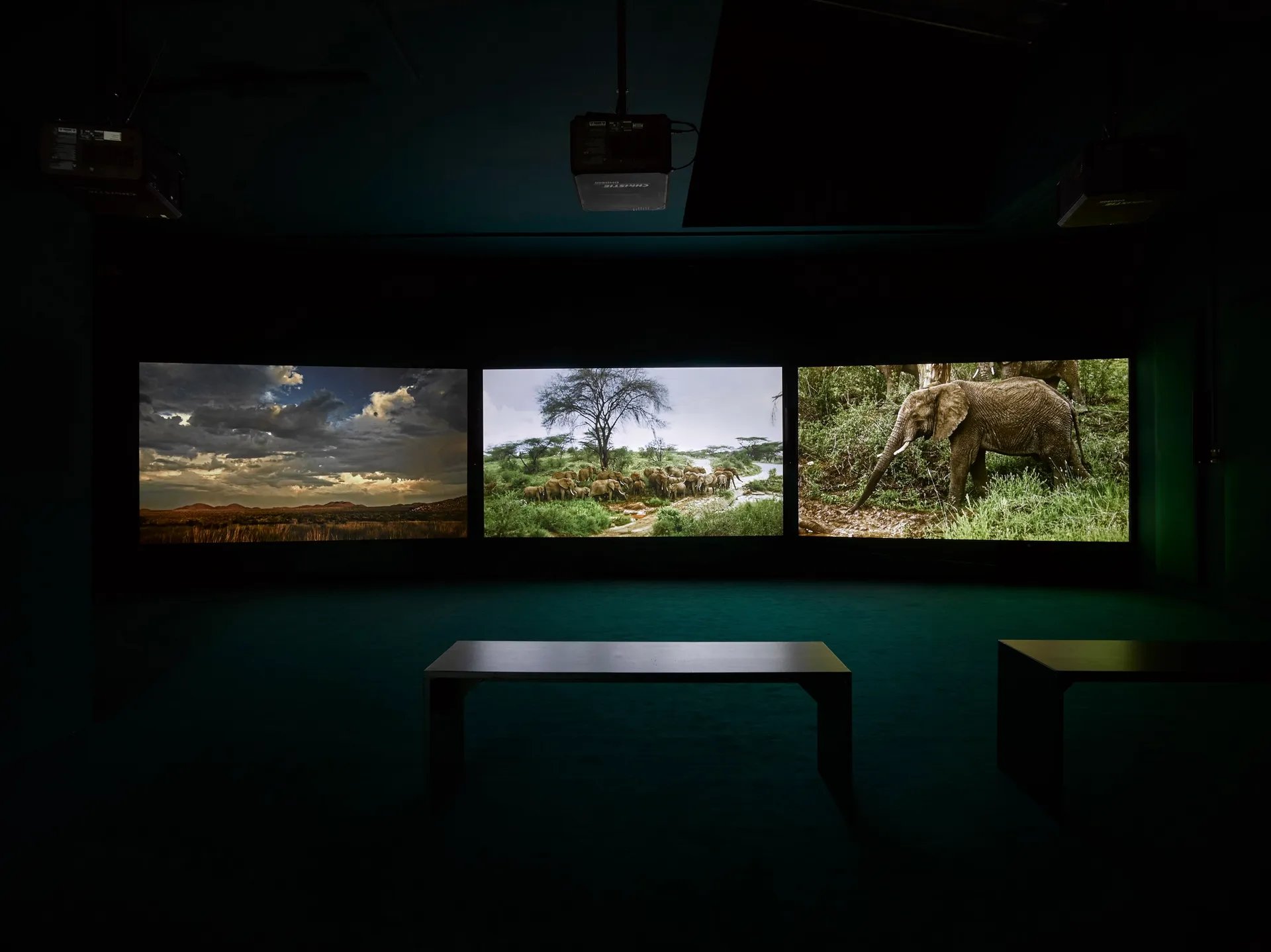 La deuxième partie du projet épique Purple (2017), présentée dans l’espace The Cuve du Barbican Centre à Londres en 2018, est une installation vidéo sur six écrans qui reflète la vision nuancée et pénétrante de l’artiste sur la menace insidieuse du changement climatique. En 2019, il a montré la troisième œuvre de la trilogie, Four Nocturnes, au premier pavillon du Ghana à Venise, et se concentrait sur la destruction du monde naturel par l’humanité via le déclin des troupeaux d’éléphants en Afrique.