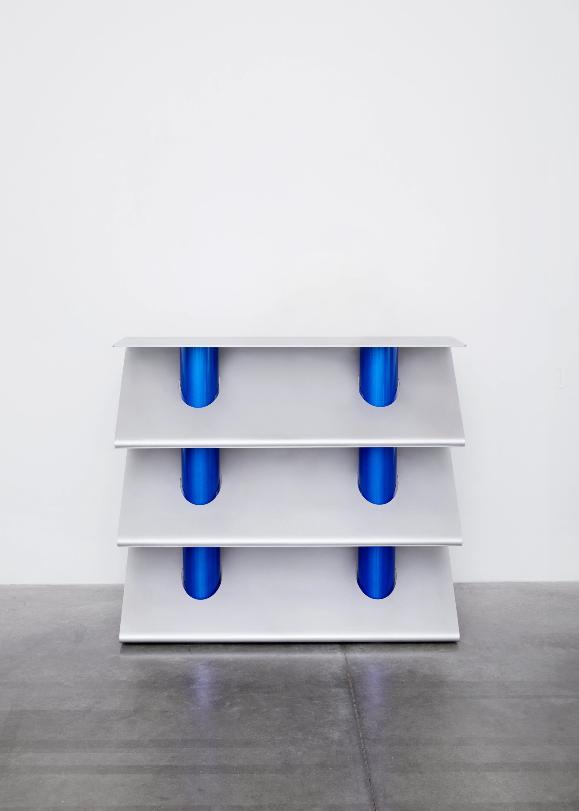 Ce vaste ensemble témoigne du désir des jeunes talents d’expérimenter les matériaux, comme l’illustre la console Pli de Victoria Wilmotte. « Je travaille beaucoup avec l’acier et le pliage car je suis très influencée par l’industrie, explique cette dernière. Cette pièce a été réalisée en pliant une seule feuille d’aluminium, découpée au laser, tandis que deux tubes la traversent. J’aime faire contraster le côté très industriel, brut, avec un aspect très fini, luxueux, du vernis et ajouter une touche de couleur ».