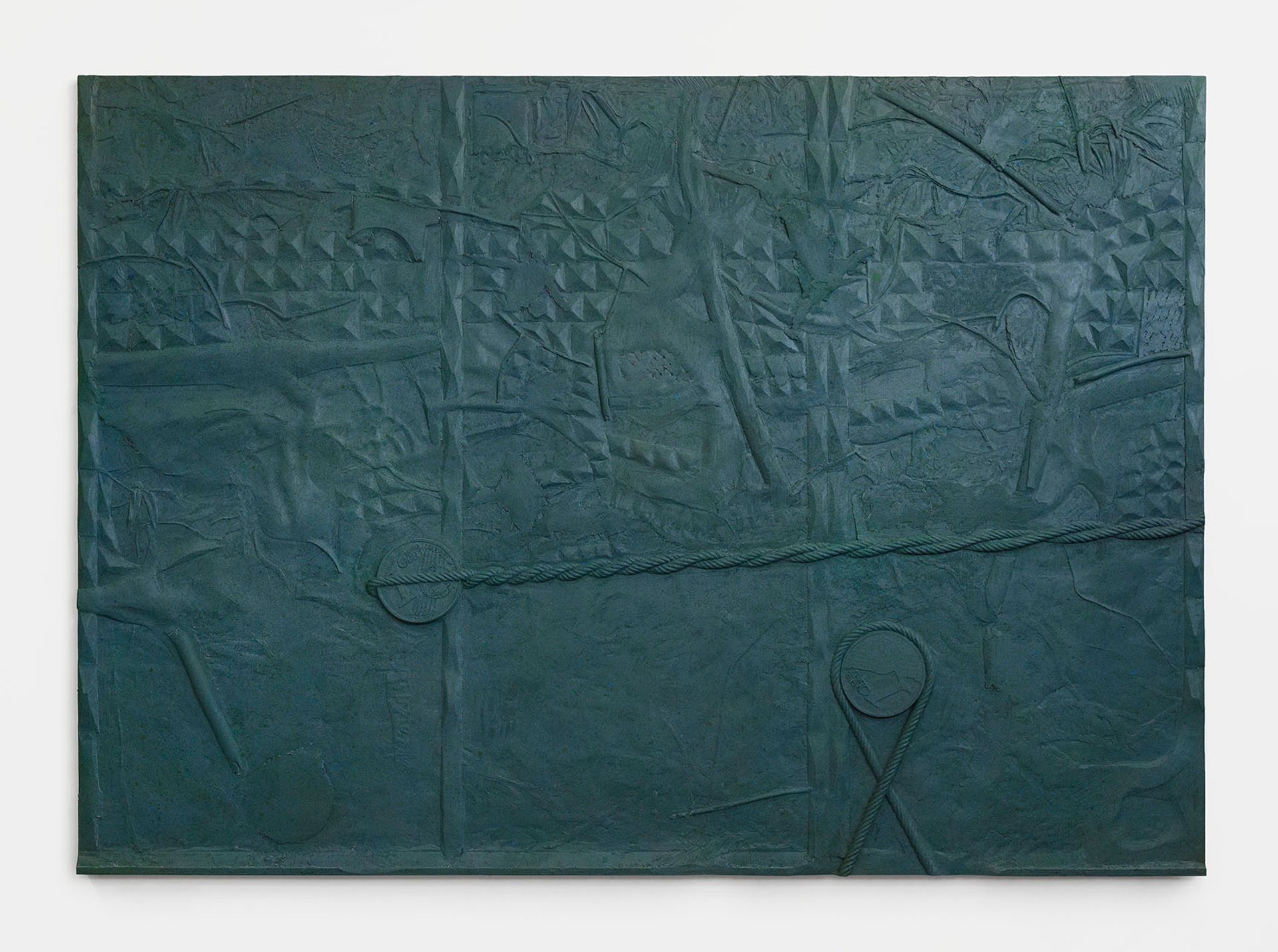 Des deux grands bas-reliefs en résine et fibre de verre autour desquels se construit la présente exposition, celui qui offre le plus de lisibilité porte le titre beau et intrigant de Seguaci del Verdeazzuro (partisans du vert azur). Où sont et qui sont ces partisans ? Quelle est leur cause ? S’offre à nous une forme de paysage puisqu’on y voit des arbres, et des plans striés qu’on n’identifie pas clairement mais qui pourraient figurer un sol travaillé par une activité agricole. Superposé à ce paysage ou bien inscrit dans celui-ci, deux pièces très agrandies de 1 centime d’euro, l’une entraînée ou entraînant une corde à l’horizontale, et l’autre entourée dans la boucle d’un tronçon de corde à la verticale. Ce centime porte sur sa face exposée un globe terrestre et une douzaine d’étoiles rayonnantes. Oubliant l’éventuelle allégorie d’un asservissement à la valeur monétaire, ce maigre symbole offre un miroir et une source de méditation à une œuvre qui s’attache à faire revivre l’art du bas-relief dans un matériau sans noblesse.