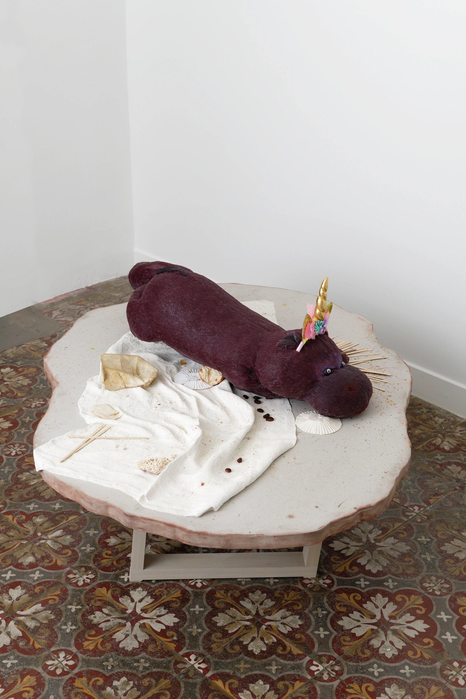 Outre une guirlande végétale suspendue autour d’un gobelet jetable fixé au mur, ce sont deux figures animales qui nous accueillent, deux jouets du genre objet transitionnel : un singe vert couché sur un alignement de gobelets posés sur un guéridon et de pailles à boire, dont certaines traversent ses pattes, et un hippopotame brun affalé sur sa table sur quelques papiers et agitateurs en bois, et qui porte en serre-tête une corne de licorne. Ces figures à peu près décrites sont en silicone ou gypse polymérisé. Un regard détaché ne verra là qu’une débauche d’objets ou de simulacres, tandis qu’un minimum d’empathie nous fera considérer la souffrance d’objets maltraités, et, montant encore d’un degré dans la fiction, celle d’animaux plongés dans la débauche et reflets de l’humain. Aux murs, ce sont des boîtes qui nous regardent, petites boîtes d’emballage ouvertes contenant chacune un assemblage de pièces d’habillement (chemise, gant…) et de menus objets avec quelques étiquettes de marques en évidence. Ces boîtes laissent voir un moment suspendu entre l’archive et l’abandon, peuvent d’un regard se changer en matériau pour l’histoire ou matière à recycler. Interrogeant notre relation aux choses, Liz Magor excelle dans le mélange des genres et des sentiments.