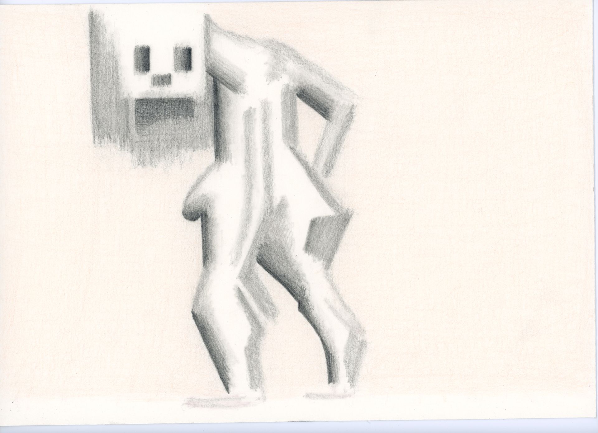 L’enseigne expose un choix de dessins fait par le galeriste Bernard Jordan dans la production foisonnante de Paul van der Eerden. Ces feuilles, où la figure humaine est omniprésente, sont le plus souvent soignées, avec de beaux volumes rendus par des dégradés à la mine de plomb et, dans bien des cas, avec l’emploi de crayons de couleur pour le fond. L’ensemble évoque un univers futuriste angoissé, un peu daté, dans lequel les individus tantôt se perdent dans l’anonymat de masses, la mécanique des rapports sexuels, tantôt sont traversés par l’angoisse ou le cri, plus rarement par la sérénité d’une plénitude formelle ou d’une épure. Un bel exemple de ces libres associations est cette image d’un corps en mouvement de profil venant rencontrer une tête cubique qui crie ou s’apprête à le faire, sans s’être annoncée. Paul van der Eerden nourrit son imagination de littérature et de poésie, il dit qu’il aurait aimé faire de la bande dessinée et que ses dessins traduisent aussi ce désir de récit. Et d’ailleurs, il pratique parfois la fragmentation en cases ou séquences visuelles. On croise, incidemment, les ombres de Giovanni Battista Bracelli ou de John Singleton Copley, le tubisme et le cubisme. Ces concentrés d’histoires parlent aussi du travail, de la liberté sous contrainte (celle du cadre, celle de la variation) que représente cet engagement quotidien dans le trait.
