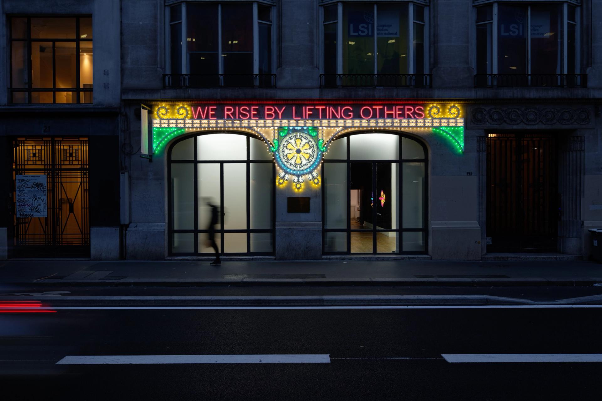 « We rise by lifting others » (nous nous élevons en soulevant les autres) : c’est par cette citation en lettres de lumière Led, augmentée d’une guirlande et d’une rosace disposée en façade de la galerie, que Marinella Senatore nous invite à découvrir son univers artistique tourné vers l’action et la participation. Le style de cette enseigne, emprunté aux décors de fêtes religieuses ou civiles du sud de l’Italie, et l’appropriation de cet élément de culture populaire ont valeur de manifeste. C’est d’abord par des performances collectives avec des amateurs, voire des foules d’amateurs, que Marinella Senatore s’est fait connaître. La grande photo qui nous accueille présente un groupe presque exclusivement féminin, qui semble s’être compacté dans l’urgence pour faire tableau ou sculpture. Elle promeut avec drôlerie la School of Narrative Dance qui est la grande affaire de l’artiste, appel à une narration partagée. Ce bloc humain est un concentré d’action et d’histoires, un bloc d’énergies, un monument au présent. Malgré les dessins inspirés de manifestations de rue, l’artiste n’appelle pas à l’insurrection mais à « l’alliance des corps ». Pour cet engagement politico-artistique, elle n’hésite pas, dans des collages ou des œuvres lumineuses, à faire du doute de Beckett (Dance first, Think later) un programme d’action, et du « je » de Walt Whitman (I contain multitudes) une expression du collectif.