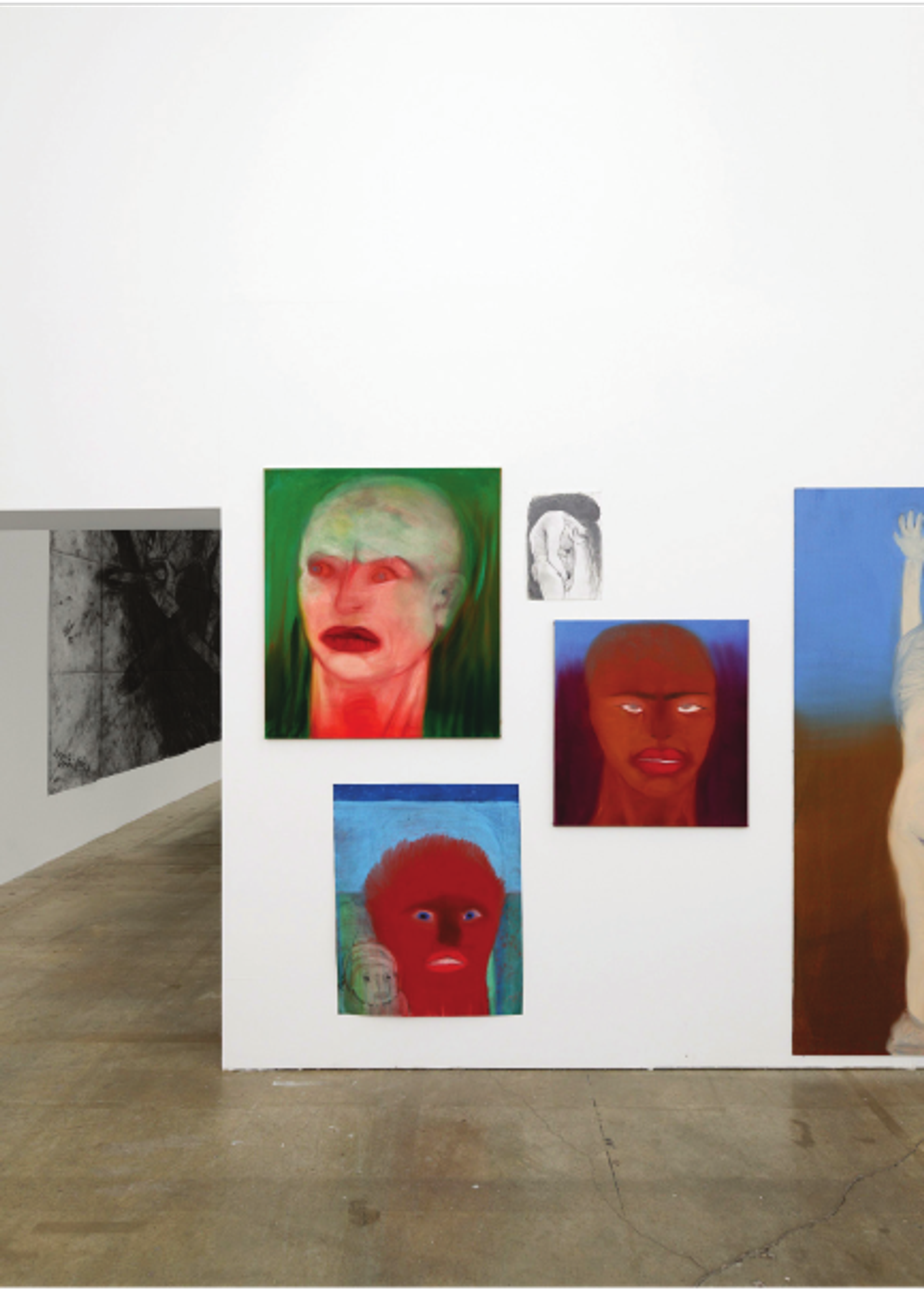 Cette intensité, elle la retrouve en accrochant ses expositions, grâce à la légèreté des œuvres qu’elle conçoit de façon à pouvoir les manipuler : « Je dois avoir ce moment où je peux courir avec mes peintures et les poser partout. Ça va très vite, mais je dois pouvoir les porter. C’est justement ce que me dit la pensée par le corps, qui est très juste : elle ne me dit pas si c’est bien ou mal. Elle dit : “On fait comme ça”, “On ne peut plus faire comme ça, on fait autrement”. Et ça, ça me plaît beaucoup. » C’est aussi ce qui fait que, dès l’entrée de l’exposition, on se trouve saisi, pris entre, d’un côté l’ample courbe du Palais de Tokyo, les grands formats sur papier alternant entre le noir profond du fusain – qui, tantôt trace des scènes associant humains et animaux, tantôt engendre d’immenses paysages agités d’innombrables secousses – et les couleurs vives et liquides de champignons atomiques; et, de l’autre côté, des figures peintes en pied, toutes semblables, quoique traitées avec une grande variété de registres formels et chromatiques, toujours frontales, nous faisant face (RAUM-ICH [Espace-moi], 2010). On se trouve entraîné, hors de la linéarité chronologique, par ce mouvement sans fin, par cette « pensée sérielle » qui donne son titre à l’exposition.