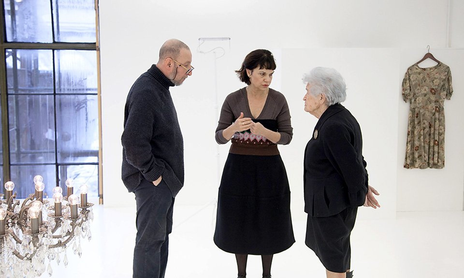 Marina Lochak, Irina Alexandrovna Antonova et Alexander Brodsky dans une installation d'Alexander Brodsky. Photo : Musée d’État des beaux-arts Pouchkine