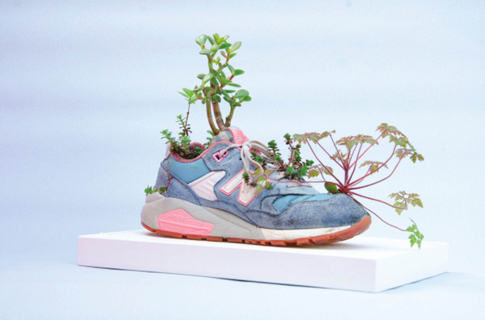 Michel Blazy, Sans titre, 2018, plantes, terre, eau et chaussure de sport.