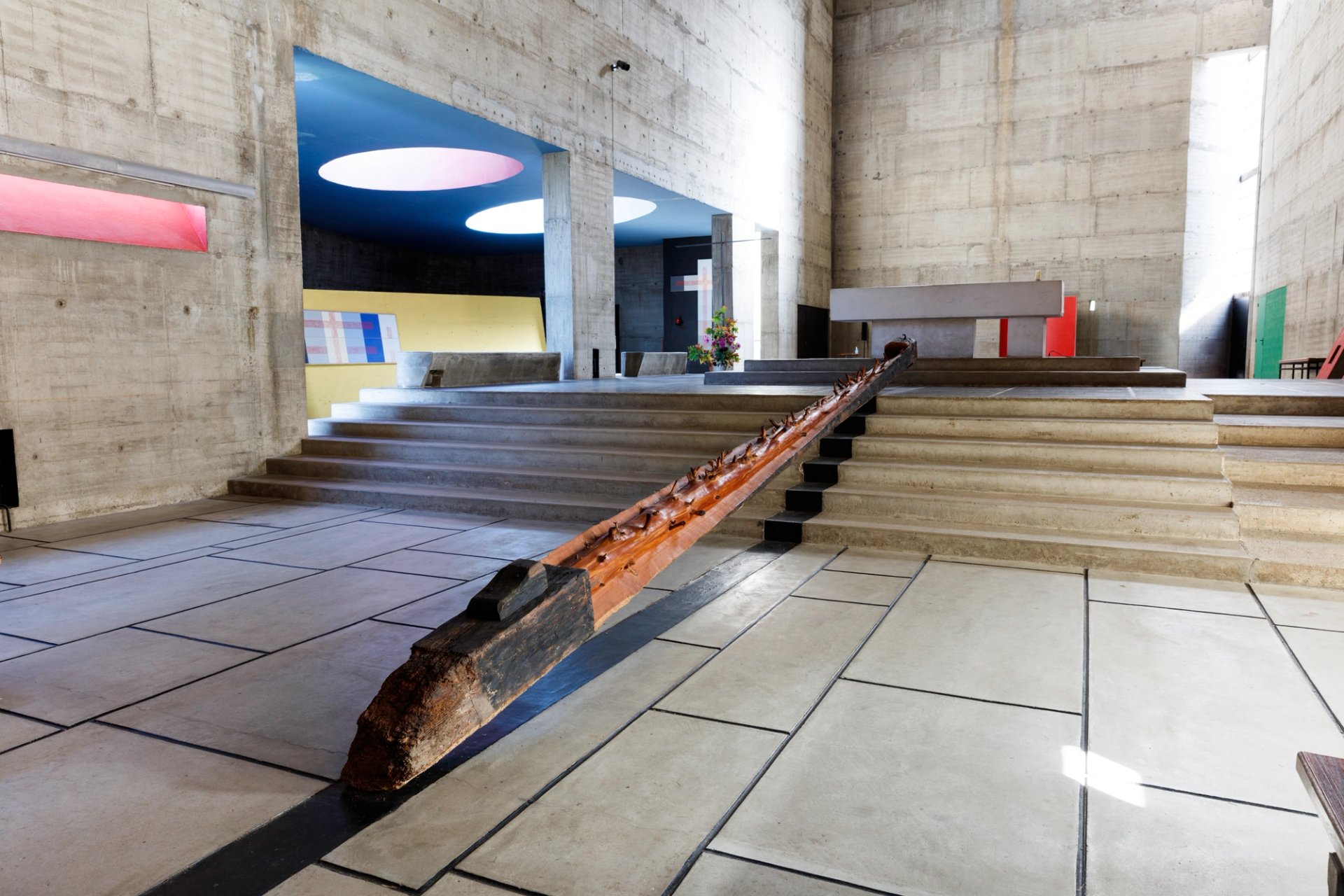 Vue de l’exposition « Giuseppe Penone à La Tourette » au couvent de La Tourette, à Éveux, en 2022, avec Albero in torsione sinistra [Arbre en torsion gauche], 1988, bois de mélèze. © Archivio Penone