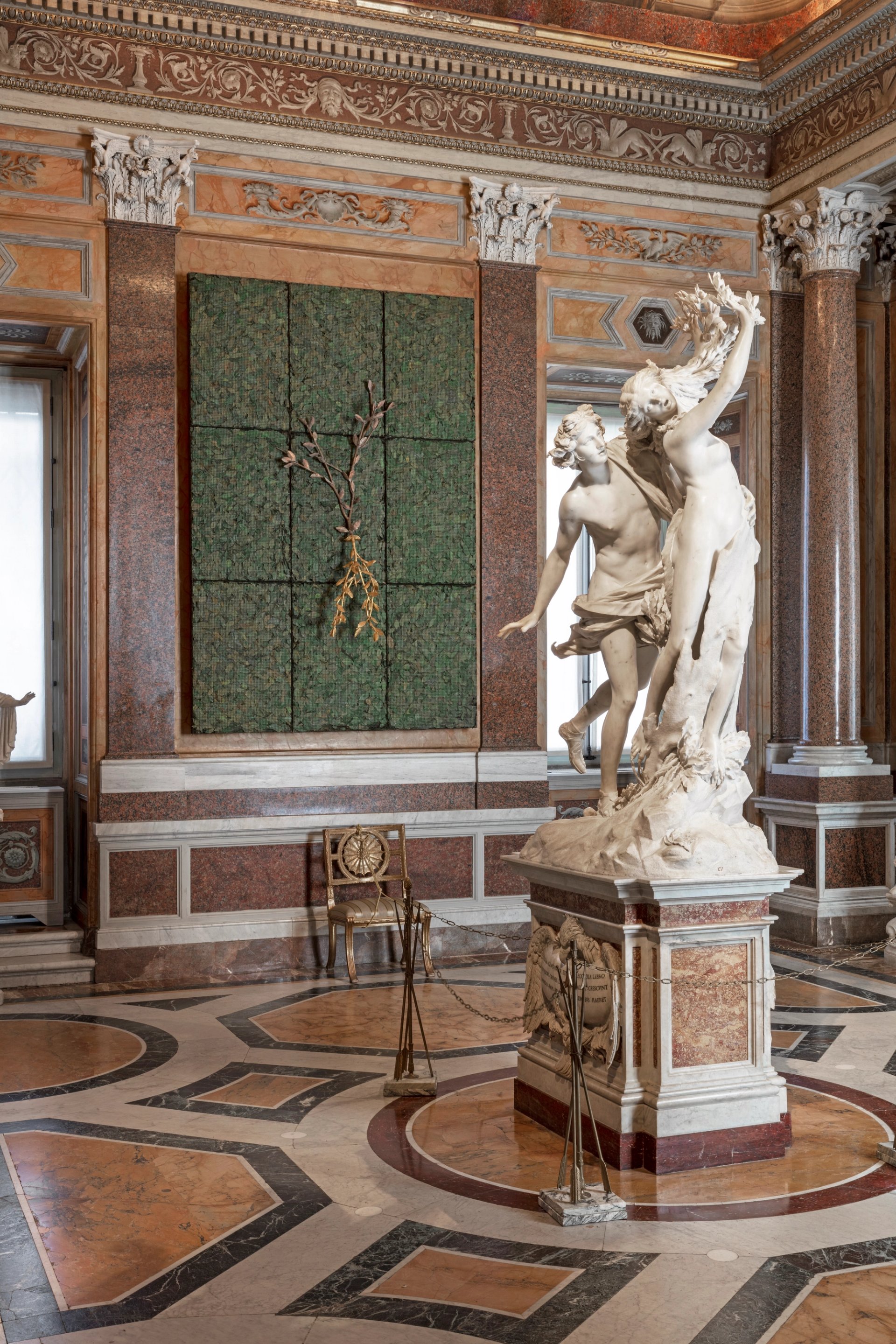 La Galleria Borghese n’est pas conçue pour montrer de l’art contemporain. La collection Borghese visait à rassembler des merveilles, qu’il s’agisse d’œuvres d’art ou de plantes rares dans les jardins. Il y avait aussi une volière avec des oiseaux exotiques. L’idée était d’étonner. Intervenir dans ce lieu n’est pas aisé mais très stimulant. Si l’on se contente d’une simple confrontation formelle avec ses propres œuvres, à mon avis, c’est raté. J’ai donc cherché dans mon travail des éléments susceptibles de dialoguer avec ceux présents à la Galleria. Un ensemble d’arbres est disposé dans l’entrée, comme un petit bois, en référence à la nature mais aussi à l’architecture. J’ai ensuite choisi de n’exposer que dans trois salles. Pour sa sculpture Enée, Anchise et Ascagne, Le Bernin a focalisé son attention sur la peau. Cela résonne avec certaines de mes œuvres sur le toucher. Dans la salle des Empereurs, où figure son Enlèvement de Proserpine, j’ai installé des pièces exprimant l’idée du souffle, de l’empreinte du corps, notamment celle constituée de feuilles, Respirare l’ombra. Enfin, dans la salle qui abrite Apollon et Daphné, j’ai accroché au mur deux œuvres composées de feuilles de laurier. Dans les jardins, le dialogue se poursuit entre végétal et sculptures en bronze. Il a fallu trouver le meilleur moyen de s’intégrer dans l’intimité d’un tel lieu. Exposer aux côtés du Bernin est une expérience exceptionnelle, qui confronte deux approches de la sculpture.