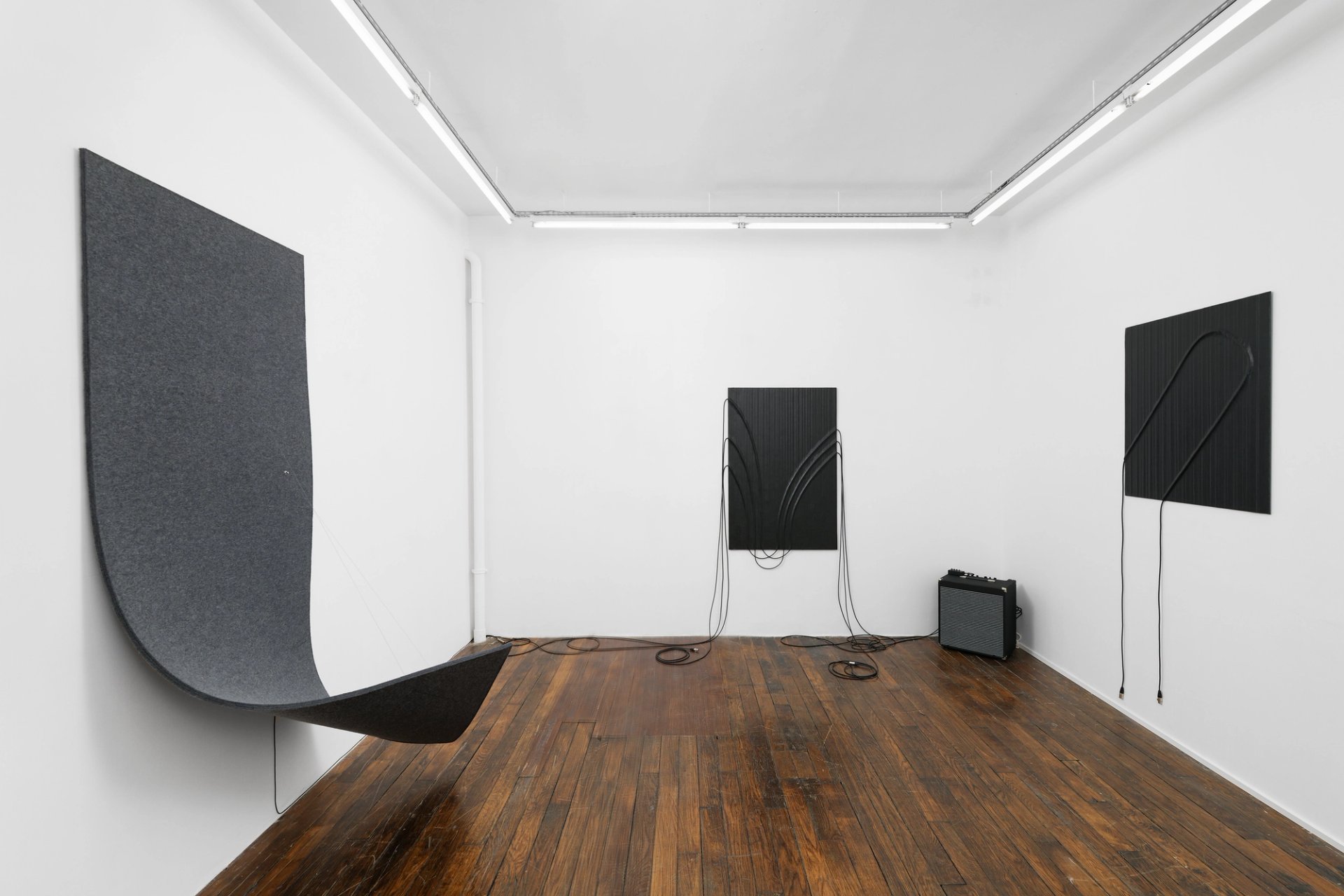 Suspensions est une série de tableaux-reliefs noirs, des réseaux de câbles entièrement recouverts de gaffer. De ces tableaux tombent les extrémités des câbles avec leurs prises, suggérant également une activation. Le gaffer est ce ruban adhésif employé au cinéma ou sur les scènes de concerts pour fixer les câbles ou masquer certains accessoires. Pour Naama Tsabar, ce matériau symbolise le masquage et, par cette série d’œuvres d’inspiration constructiviste, elle rend hommage à un collaborateur de l’ombre. Un isolant qui sonne, un masqueur qui s’affiche par souci de transparence, on comprend que l’artiste a le goût du retournement. Dans sa musique, elle s’emploie à déconstruire la masculinité du rock, du metal en particulier, et n’accomplit ses performances qu’avec des femmes ou des personnes non-binaires.