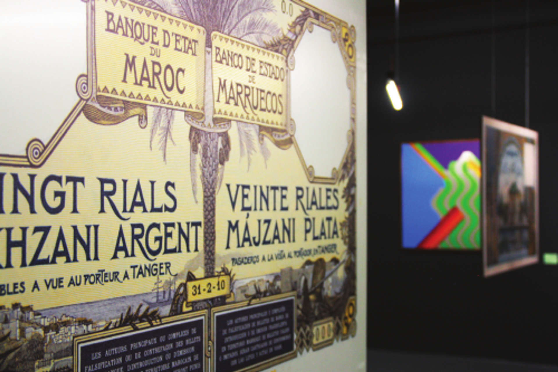 Vue de l’exposition « Une archéologie des images. Le billet de banque au prisme de l’histoire de l’art », musée d’Art Moderne et Contemporain Mohammed-VI, Rabat, 2022. Agrandissement du 20 Rials Makhzani, 1910. Photo Nina Pilon