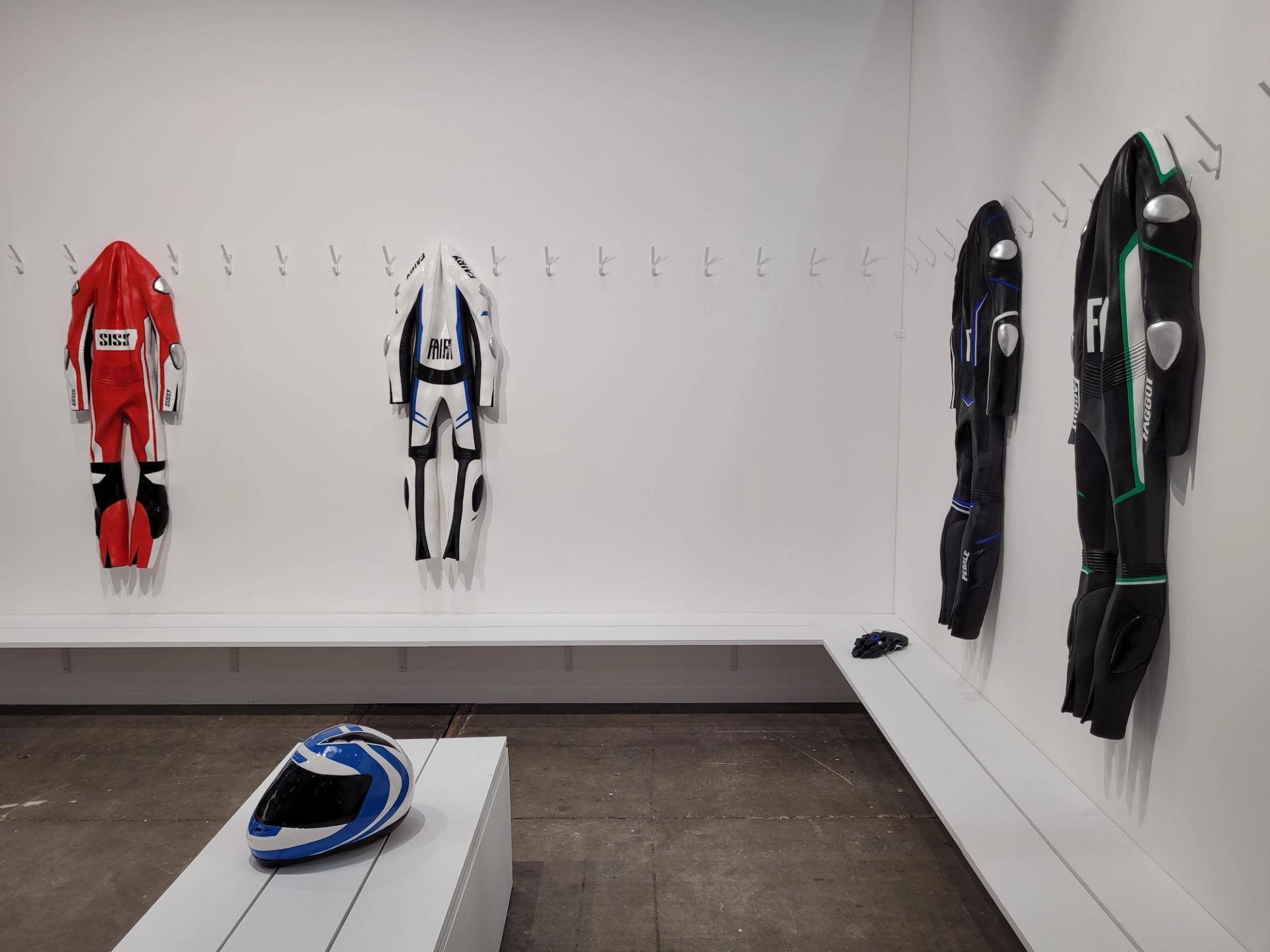Mais est-ce vraiment son intérêt d’attirer de plus grosses galeries, d’exposer des pièces plus chères, ou d’inviter le top des collectionneurs ? Ne bénéficie-t-elle pas en définitive du virage plutôt mainstream apporté par Paris+ par Art Basel, en gardant sa propre identité ? À condition cependant de rester une foire de découvertes, son grand argument. Pour Alain Servais, même dans une foire censée être « de découvertes » comme Art Brussels, peu d’exposants osent prendre des risques. « Ce sont surtout les primo participants qui ont besoin de se faire connaître », confie-t-il. Et de pointer le stand de la galerie française Septième. Celle-ci avait transformé tout son stand en vestiaire de pilotes de courses, avec des combinaisons accrochées à des patères au-dessus d’un banc courant le long du mur. Mais en regardant de plus près, les combinaisons étaient en céramique, plus vraies que nature, et rigides (12 000 euros la combinaison, 4 000 euros le casque)… L’artiste Louka Anargyros, queer, a voulu mixer les valeurs supposées de virilité dans un sport de vitesse, et l’homosexualité, dans un carambolage plutôt réussi.