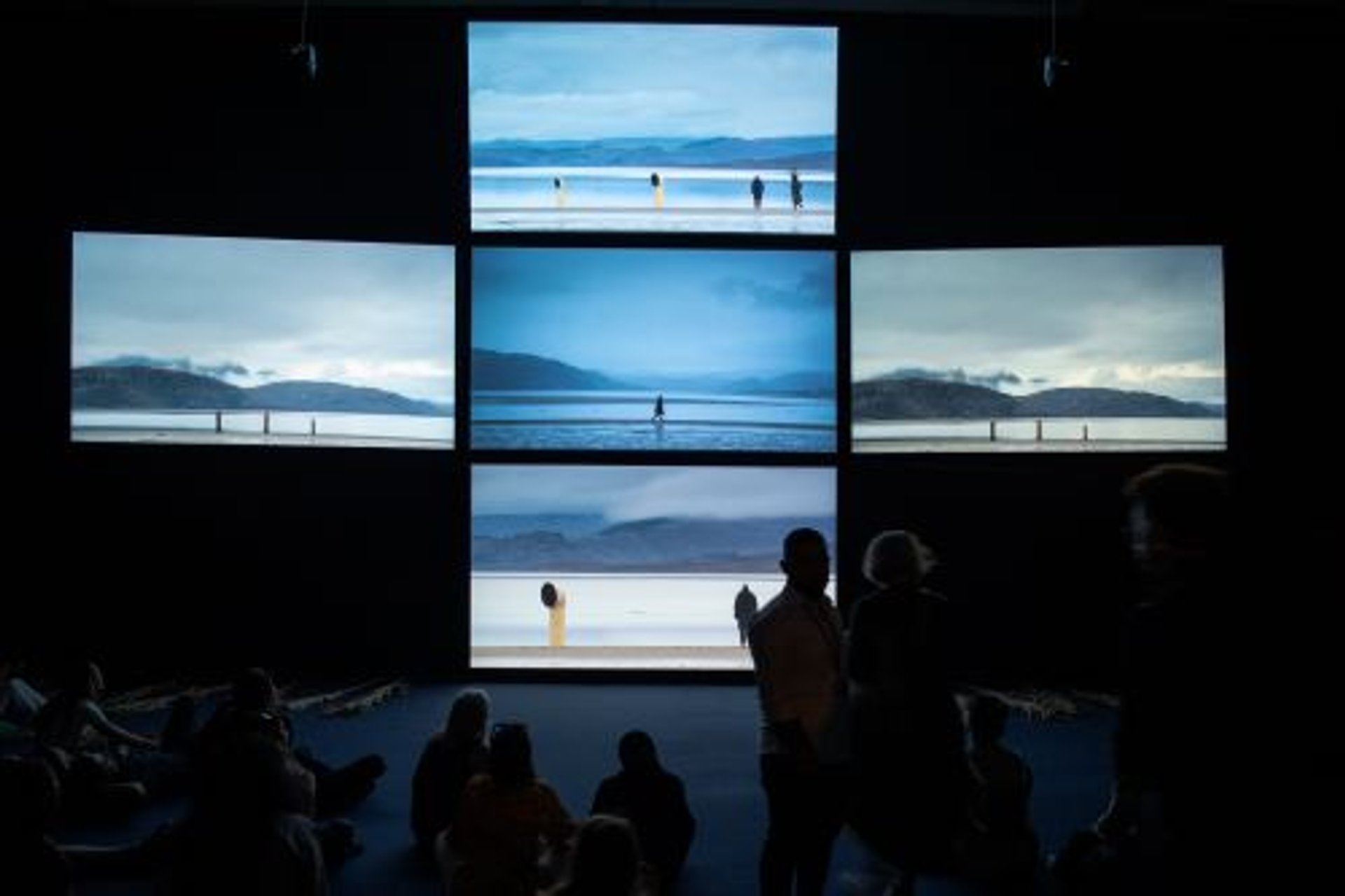 Vue de l’installation de John Akomfrah, Arcadia, 2023, à la Sharjah Biennial 15, espaces d’art Al Mureijah, Charjah, 2023. Courtesy Sharjah Art Foundation. Photo Motaz Mawid