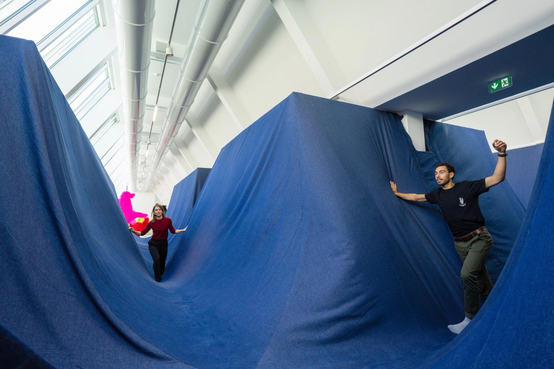 Paola Pivi, Free Land Scape, 2022, jean, métal, mousse. Vue de l’exposition de Paola Pivi « It’s not my job, it’s your job / Ce n’est pas mon travail, c’est votre travail » au [mac] musée d’art contemporain de Marseille, 2023. Photo : Hugo Glendinning. Courtesy de l’artiste et Perrotin.