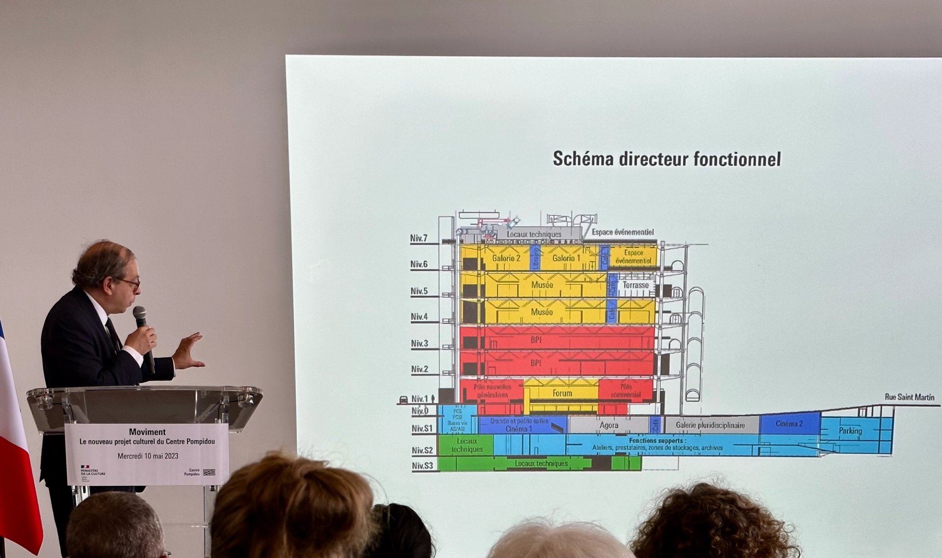 Laurent Le Bon présentant le 10 mai 2023 le projet du nouvel aménagement du bâtiment du Centre Pompidou, à Paris. Photo : Philippe Régnier