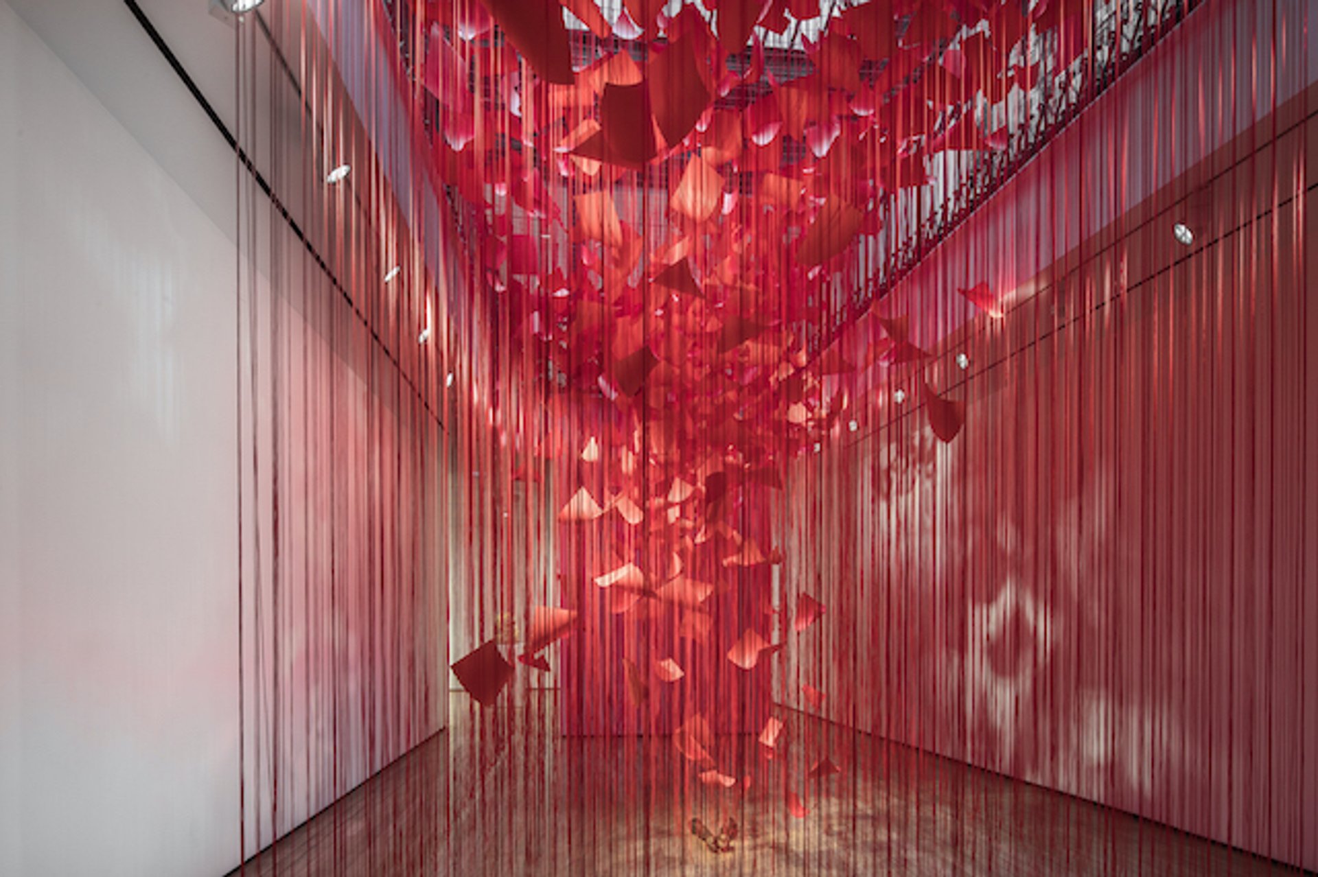 Une très longue robe blanche qui va du plafond au sol, maculée de lignes et d’éclaboussures rouges dans sa partie basse et qui tourne perpétuellement sur elle-même : c’est cette maîtresse de cérémonie qui nous accueille, robe-figure, mémoire d’une performance, qui souligne le caractère narratif de l’art de Chiharu Shiota. Letters of Love est une large construction, faites de milliers de cordes rouges suspendues dans lesquels sont prises en plein vol des feuilles de papier teintes en rouge. Au sol, dans cet espace impénétrable, sont posés deux avant-bras et mains en bronze qui pourraient figurer la condition humaine, entre effort et prière. Dans ses propos, l’artiste insiste sur l’importance du vêtement dans la définition de l’identité, et sur le fait qu’elle constitue un substitut à la peau. Elle parle aussi de l’importance qu’a pris pour elle le fait de présenter dans certaines de ses œuvres le moulage de ses mains, celle de son mari ou de sa fille pour immortaliser le lien entre eux. Vêtement et flux vital, symbolisé par le rouge, sont directement rattachés à l’écriture.