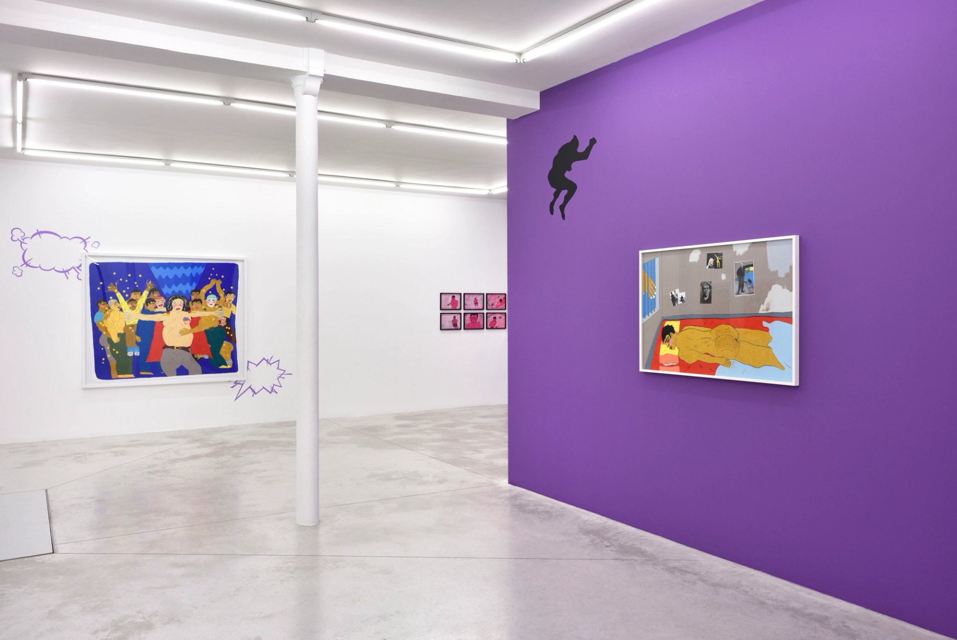 Chaque dessin et sa légende racontent une histoire à la manière d’un poème. Ababri célèbre une nouvelle fois quelques-uns de ses héros, au premier rang desquels Jean Genet. Ce dernier véritablement le hante et dans l’un des dessins, on voit différents portraits découpés du poète-ennemi décorer les murs d’une chambre aux allures de prison. Quelques murs de la galerie ont été peints en mauve, enrichis de silhouettes bondissantes qui donnent une unité à l’ensemble en même temps qu’elles font exploser le cadre. Dans un grand dessin qui fixe une scène de club rêvée, un homme torse nu, corps lourd, danse soutenu par la ferveur du groupe. Il porte une cape rouge comme un super-héros ou un boxeur. Le titre a valeur de manifeste ou de constat désenchanté, c’est selon : Aller au plaisir comme on va au devoir.