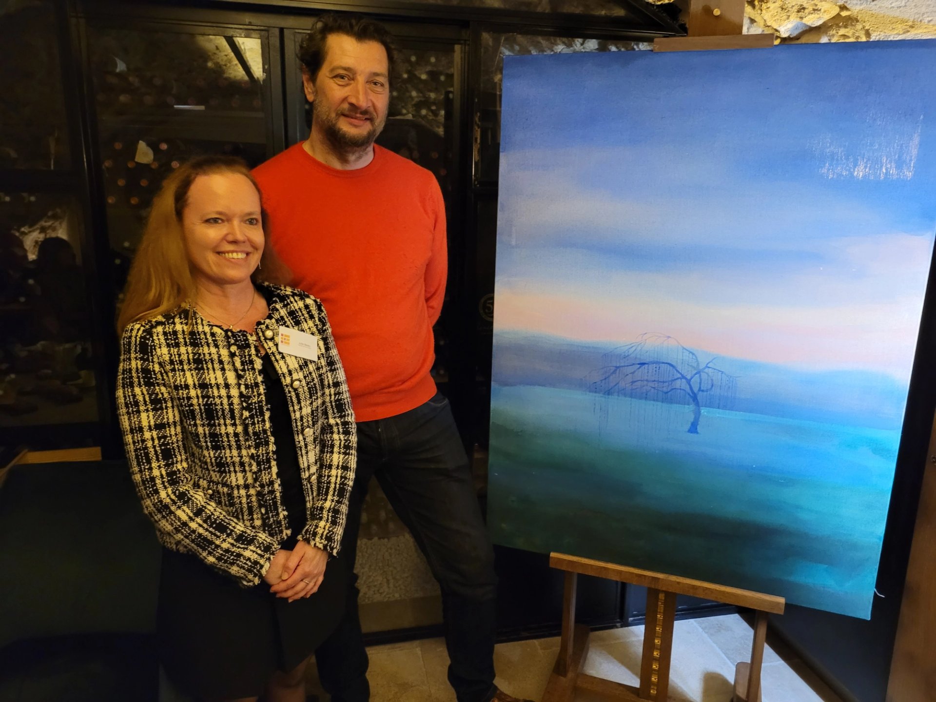 La présidente de l'association Marie Biancarelli et l'artiste Olivier Masmonteil devant l'œuvre que ce dernier a créée pour accompagner cette édition 2023 des « 5 Jours de l’objet extraordinaire ». Photo : A.C.