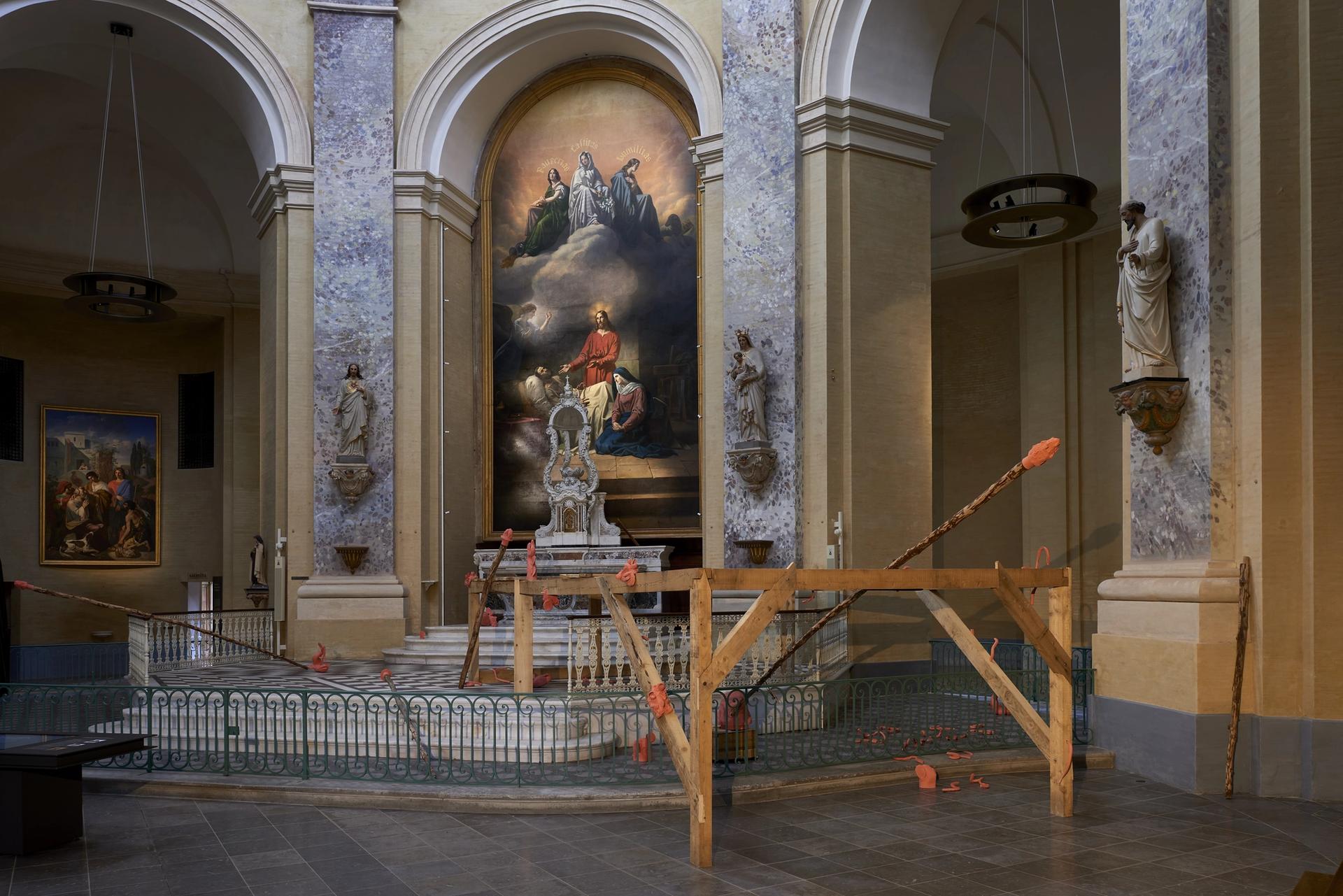 L’hôpital de La Grave, lui, a été investi de multiples façons. Sous le haut dôme et les colonnes en trompe-l’œil de la Chapelle Saint-Joseph récemment restaurée, Camille Grosperrin et Julien Desailly présentent leur première œuvre à quatre mains : Les Invisibles, installation associant une structure en bois et un ensemble de pièces en céramique inspirées des silures, anguilles ou algues de la Garonne. L’une d’entre elles, mise en mouvement toutes les vingt minutes, s’agite telle une cloche de cérémonie (ou de bateau ?), transformant l’œuvre en pièce sonore.