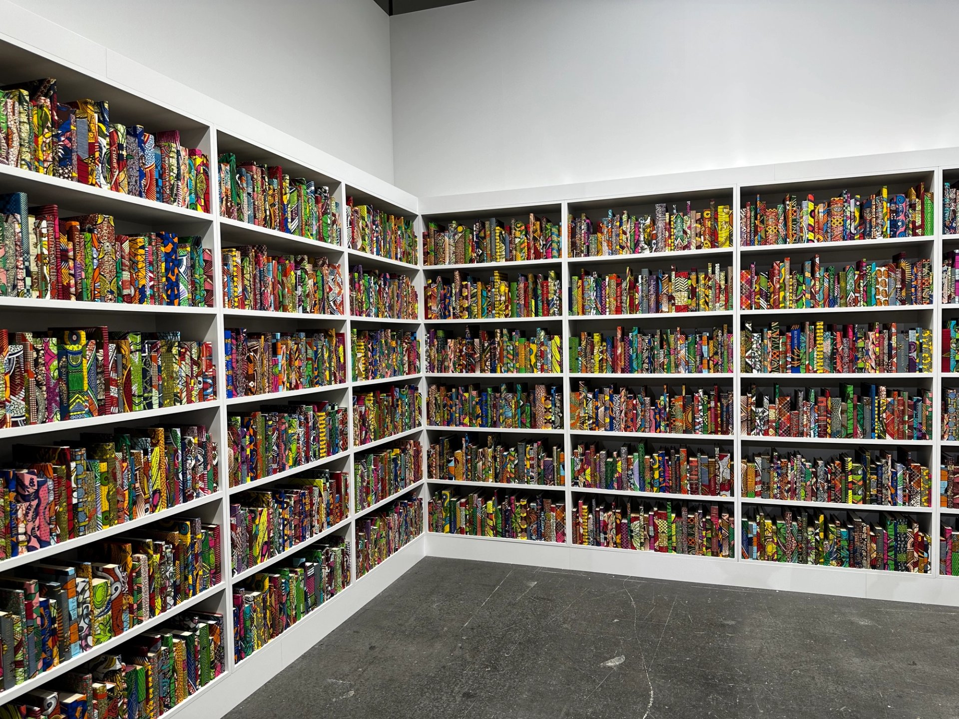 Cet alignement de livres soigneusement rangés dans des bibliothèques, dont les couvertures sont recouvertes du tissu wax régulièrement convoqué par l’artiste, rend hommage aux personnes qui ont joué un rôle crucial au sein des mouvements d’indépendance en Afrique.