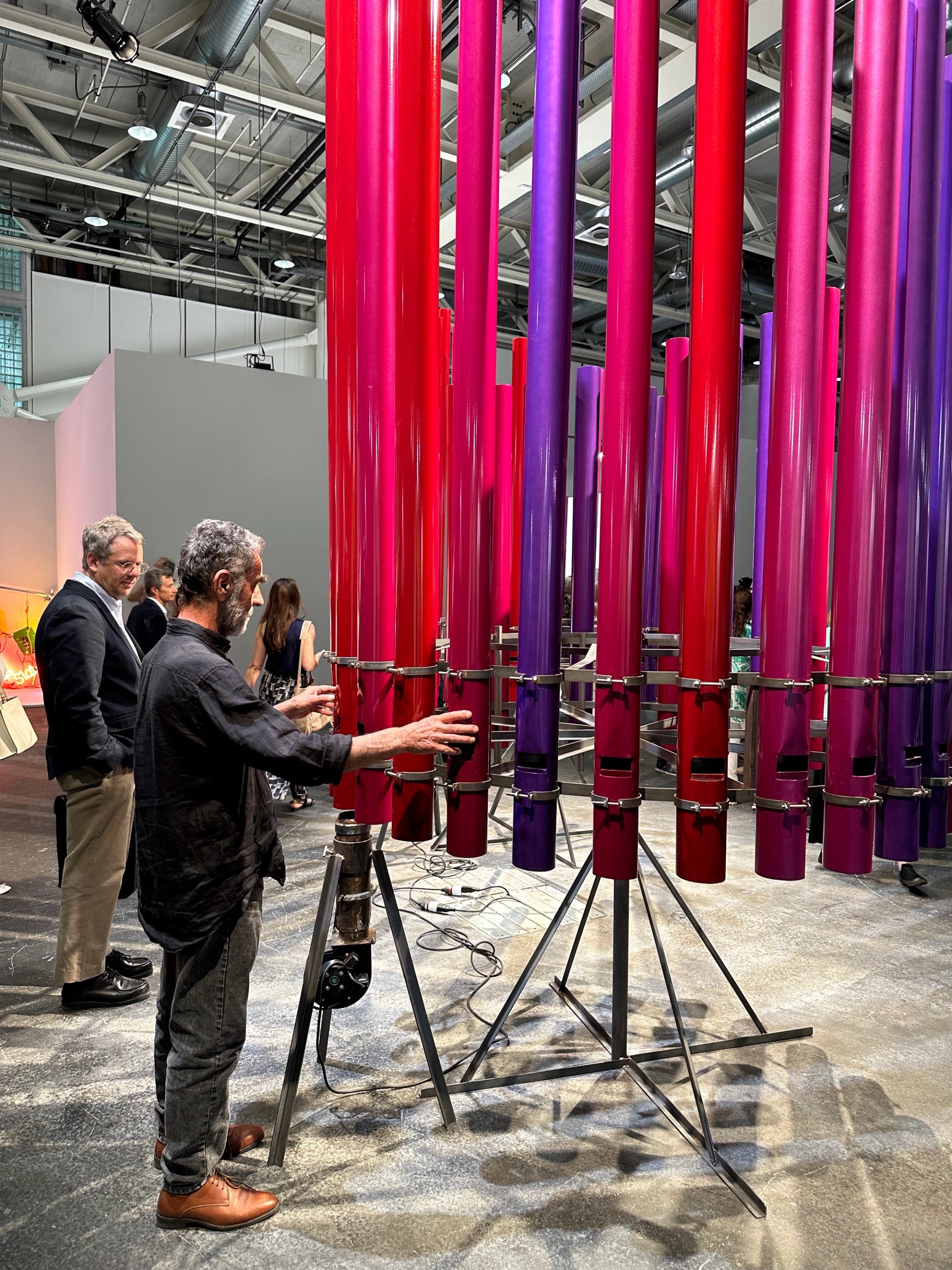 L’artiste grec Thanasis Totsikas réactive une pièce sonore initialement réalisée pour l’amphithéâtre antique d’Argos, des souffleries artisanales produisant des sons changeants en activant tour à tour des tuyaux montés sur une structure circulaire. Un son primordial qui semble issu de la nuit des temps.