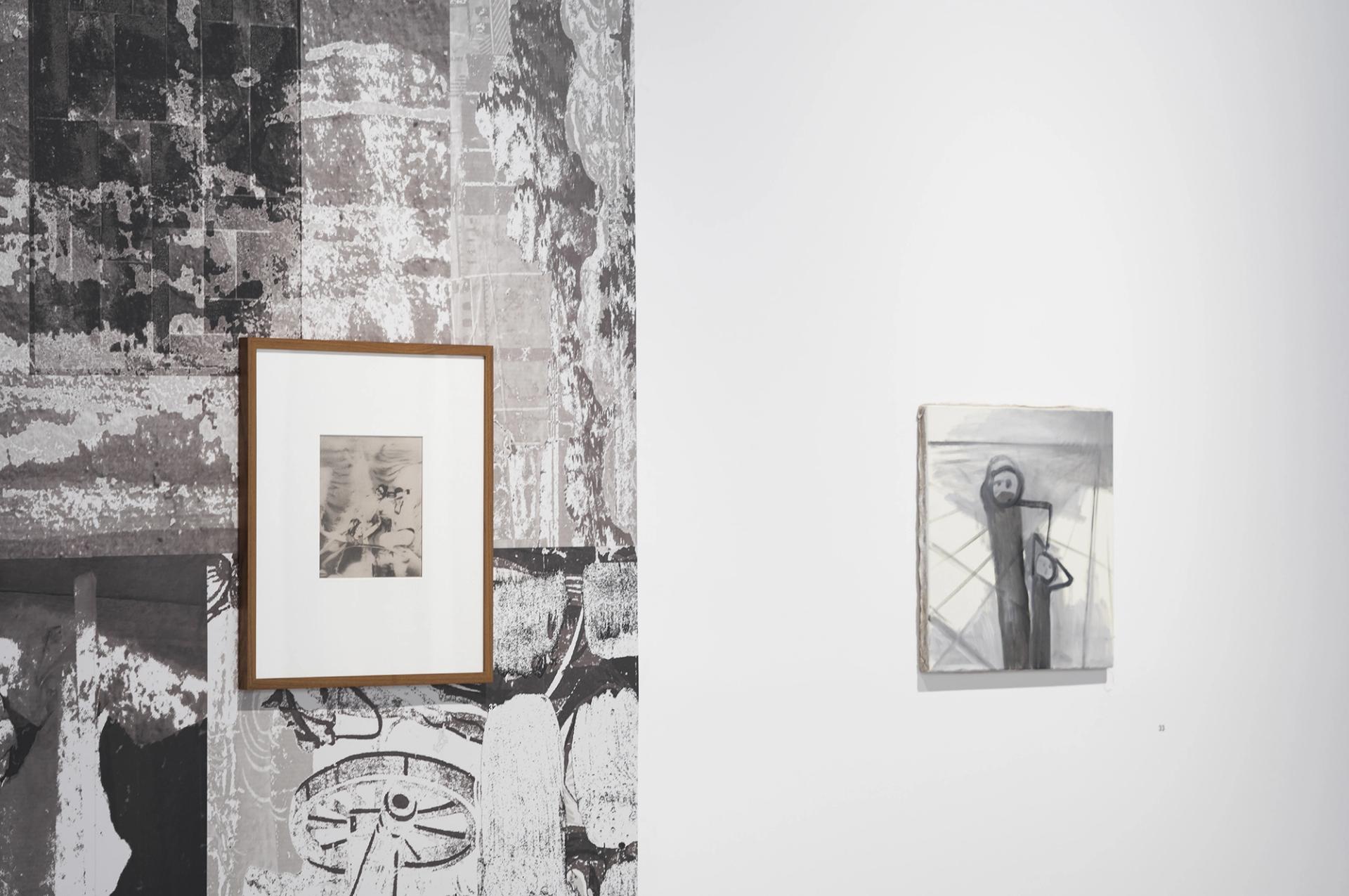 Achim Reichert, graphiste, a conçu une sorte de papier peint reproduisant des photographies de murs de palais ou de ruines historiques sur lesquelles se superposent quelques reproductions d’œuvres inaccessibles qui contribuent à donner à l’exposition l’aspect d’un livre ouvert. D’ailleurs, la reproduction d’une planche de l’Atlas Mnemosyne d’Aby Warburg figure en ouverture. C’est une belle œuvre collective, stimulante pour l’esprit qui n’empêche pas d’avoir quelques doutes quant à la persistance de la grisaille dans l’art contemporain. Le titre du tableau de Miriam Cahn, une figure tracée d’un trait enfantin, tout en valeurs de gris, semble une belle façon de ne pas répéter le mot « Grau », après Gerhard Richter et Albert Oehlen, avec lesquels elle semble en conversation. Le gris dans la peinture des années 1960 à aujourd’hui mêle questions techniques et questions d’histoire, et ferait à lui seul un imposant sujet d’exposition. La photo d’un tableau de Richter reproduit dans un quotidien signée Thomas Ruff, belle trouvaille assurément de « Grisaille Vertigo », donne déjà l’occasion d’y penser.