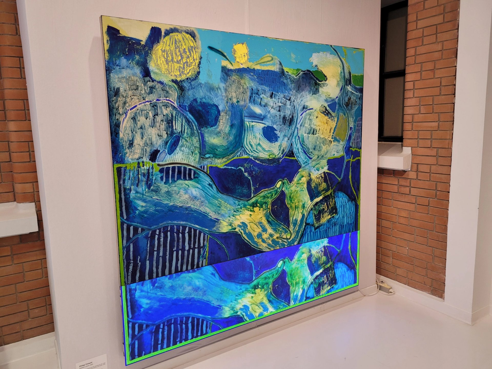Enfin, le plus novateur du trio est sans aucun doute le Viennois Philipp Timischl, Autrichien né en 1989 et qui vit à Paris. Il est défendu par la galerie Layr à Vienne et son travail avait été montré en 2020 à la Fondation Fiminco à Romainville. Sa rapporteuse, la commissaire Julie Boukobza, responsable du programme de résidences de LUMA Arles, a insisté sur sa filiation avec la peinture allemande, l’artiste ayant étudié notamment auprès de Gerhard Richter. Il a été sans nul doute influencé par l’École de Cologne, comme en témoigne la partie supérieure de ses grands tableaux. Toutefois, le bas consiste en une bande-vidéo changeante qui affiche parfois des phrases sibyllines et ironiques. L’artiste a ici réussi à associer et réconcilier, au sein d’une même surface, image inerte et en mouvement, peinture et vidéo, tradition et technologie…