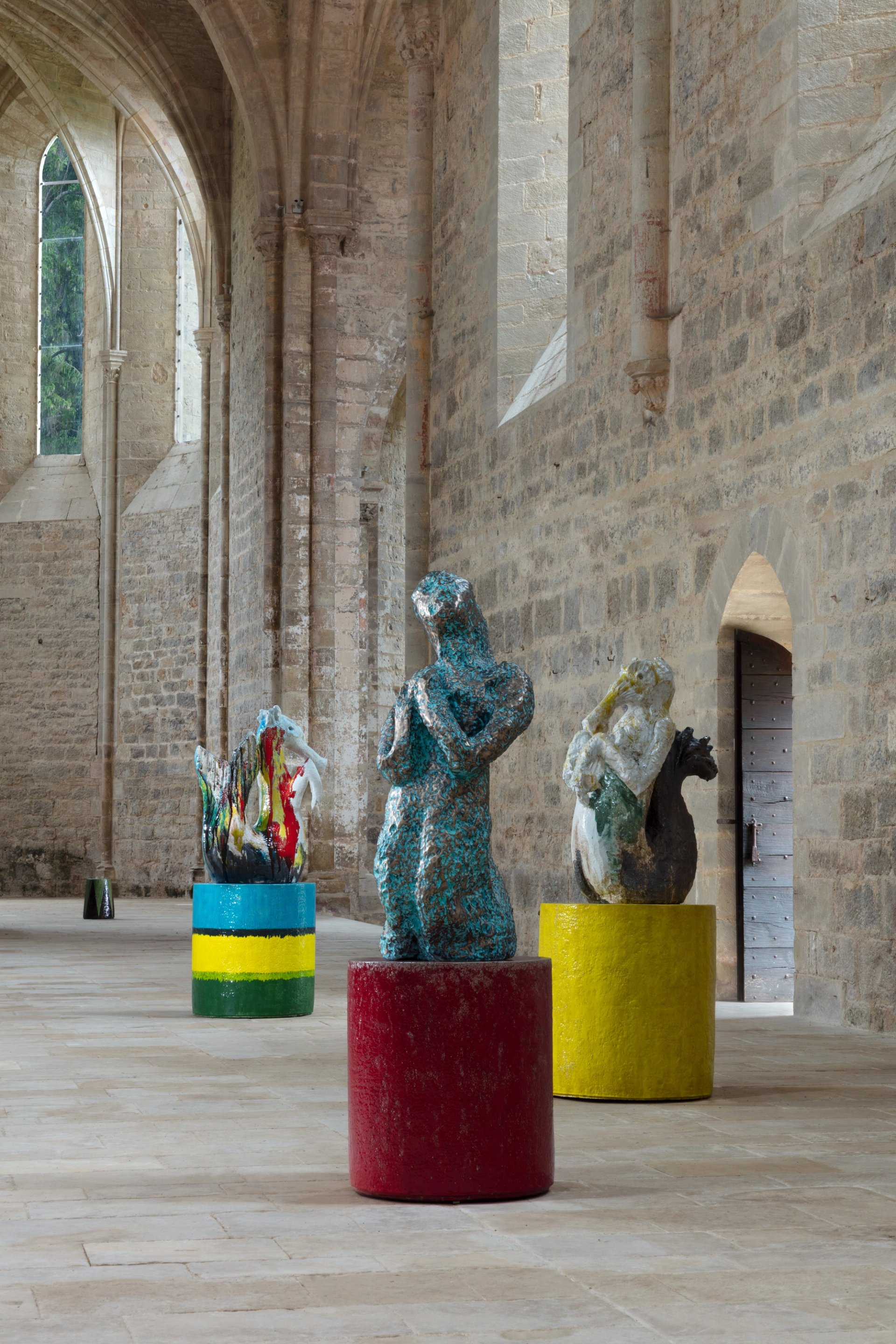 Pleinement ancrées dans le matériel, les œuvres de Creten témoignent d’un rapport au monde somme toute spirituel, si bien que bronzes, résines et terres cuites émaillées enorgueillissent par leur présence baroque cette architecture sacrée. Surtout, au sein de la majestueuse nef aux lignes élancées, des céramiques montées sur socle, cernées d’anfractuosités, font signe vers l’épure des voûtes hautement dressées et en révèlent toute la splendeur cistercienne. Ici prennent place des formes énigmatiques, potentiellement inspirées de mondes sous-marins et liturgiques. Johan Creten campe des créatures étranges dont la puissance sculpturale s’avère prolixe et conte toute une épopée humaine où la poésie, le lyrisme et les mystères ont toute leur place. Des sirènes, à savoir ces traditionnelles figures de la séduction, deviennent pénitentes, en attente de pardon : actes de prière et de contrition témoignent des affects pris dans un mouvement d’expansion.