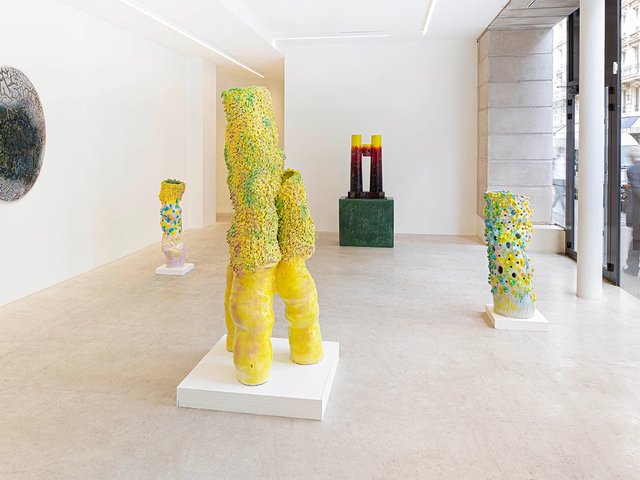 Johan Creten, vue de l’exposition « Le Coeur qui déborde », ensemble de sculptures et socles en grès émaillé. © Creten Studio et Gerrit Schreurs / Centre des monuments nationaux