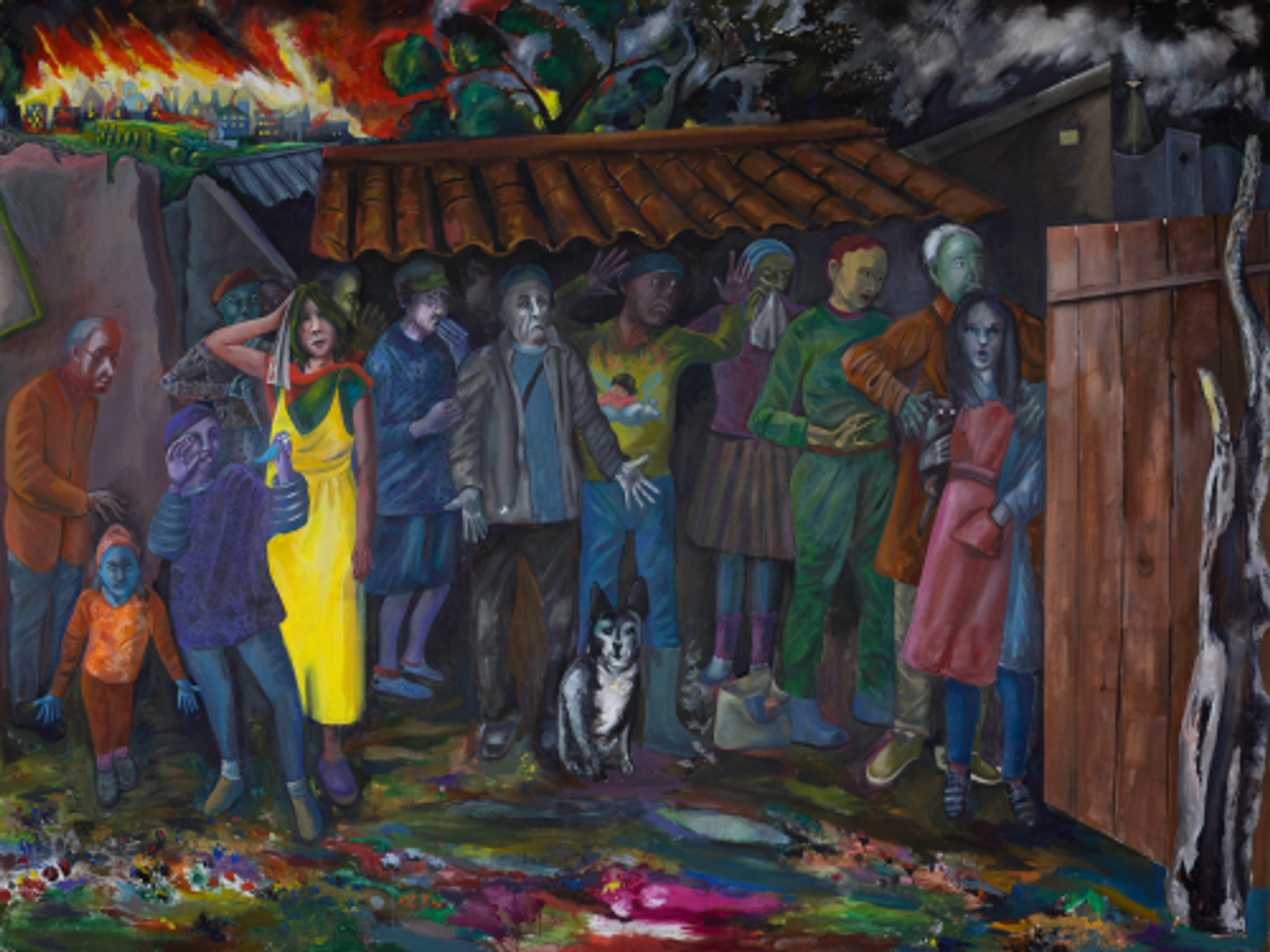 Ce qui frappe avant tout dans ces récentes toiles, c’est leur extrême densité : les personnages semblent s’y serrer (comme sur une photo de groupe pour que tout le monde soit dessus), ce qui confère à ces compositions une sourde énergie. Un peu comme si tous ces hommes et femmes ne pensaient qu’à une chose : attendre un signal et sortir du cadre pour entrer de plain-pied dans la réalité. En fait, ils y figurent déjà, dans la mesure où le spectateur ne peut échapper ni à leur posture ni à leur regard, car ils semblent littéralement nous interpeller. Et, quand ils ne nous dévisagent pas, ils dirigent à tout le moins leur regard vers l’extérieur de la toile, comme dans La Peur (2023).