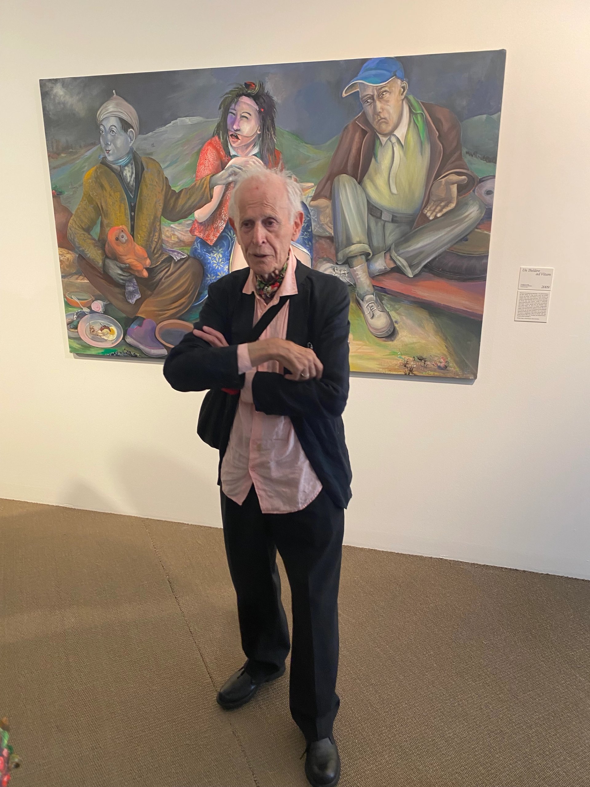 À la différence des quatre autres grandes toiles, dans Le Grand jury (2021), les personnages ne figurent plus debout, mais assis sur une estrade, également située dans ce que l’on devine être un paysage champêtre. Bras écartés et posés sur leurs genoux, visages encore plus fermés, regards encore plus interrogateurs que ceux des personnages des autres tableaux, les sept membres de ce grand jury attendant manifestement que des comptes leur soient rendus. Comme toujours, leurs costumes brassent toutes les nuances de couleurs possibles dans un foisonnement jubilatoire contrastant avec leurs visages. Un seul s’en détache, peint d’un blanc grisaillant, comme un autoportrait fantomatique que l’on retrouve aussi dans la figure altière du tableau qui clôt le parcours, Courage Martial (2021). Il fait référence à sa décision d’abandonner le pop art – « trop facile à faire », dit-il, en 1970. « Il m’a fallu beaucoup de courage pour quitter le pop art. On m’a fort critiqué. C’était cruel et douloureux. Il faut se blinder. Après ce moment dépressif, je me suis dit "Courage Martial"; et je me suis peint ! », raconte-t-il.