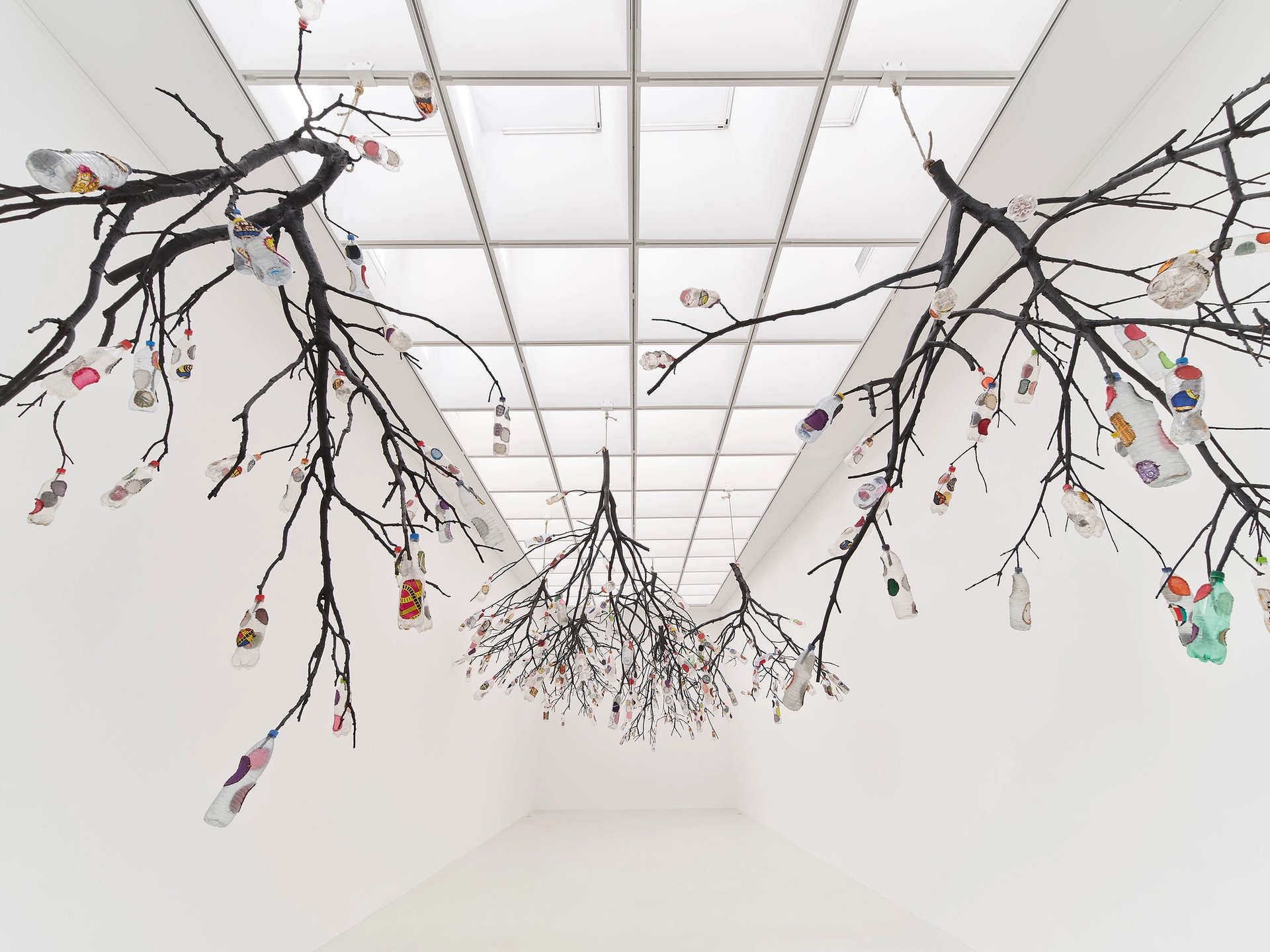 L’artiste expose aussi Oxygen (2023), une installation occupant une salle entière, composée de branches suspendues à la verrière. À l’endroit où des bourgeons et des ouvertures devraient émerger se trouvent des bouteilles en plastique récupérées dont les trous ont été réparés avec du tissu et de la couture. De loin, l’œuvre ressemble à s’y méprendre à des arbres en fleurs. De près, on se rend compte que cette œuvre évoque la pollution. « Si on bouche les ouvertures avec du plastique, les branches vont étouffer, affirme Pascale Marthine Tayou. Je ne suis pas un militant, j’exprime ce que je ressens. Cette installation parle poétiquement de ce qui se passera si nous ne faisons pas attention à faire des gestes pour l’environnement ».