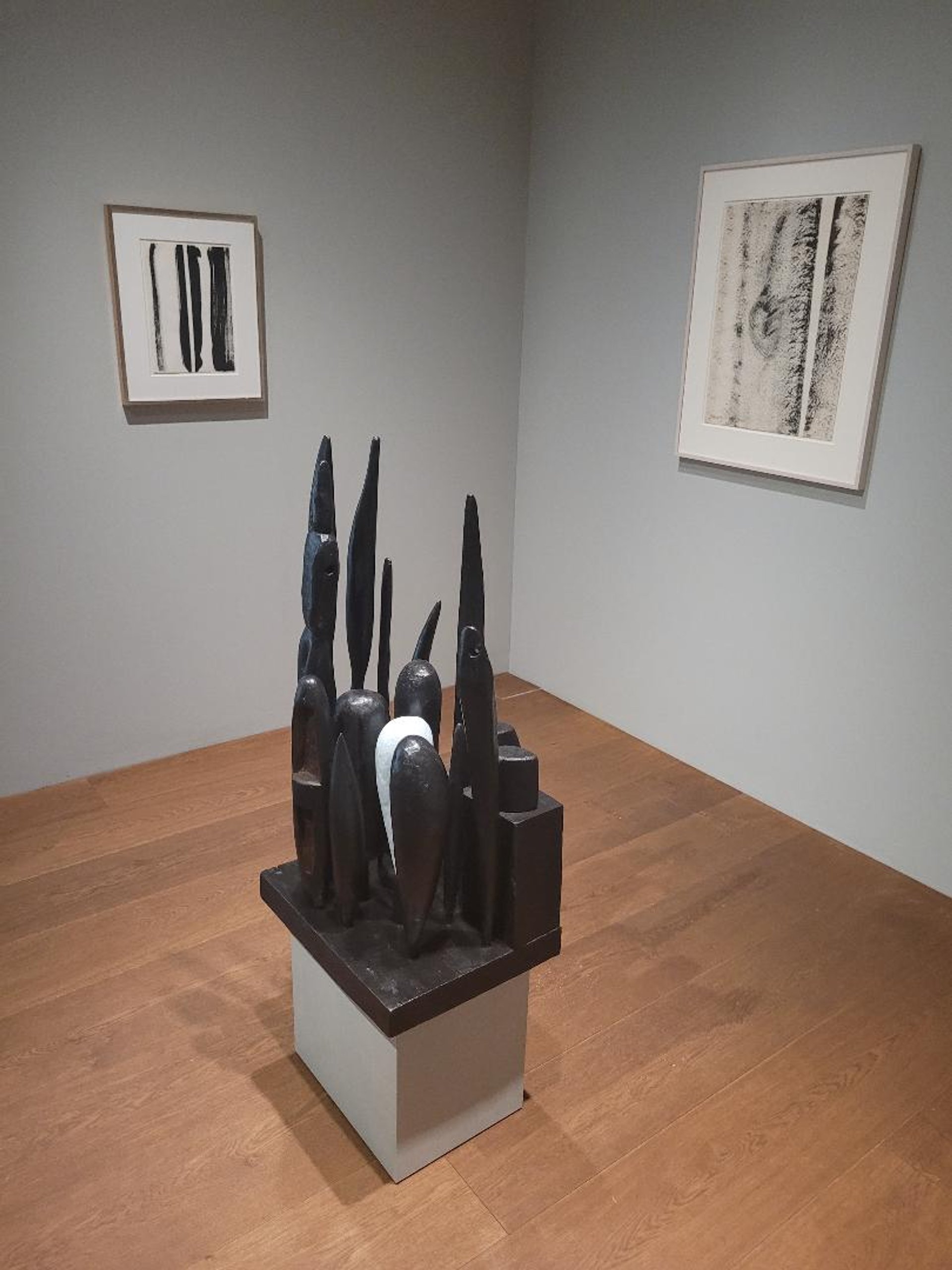 Si l’on met de côté cette lecture contemporaine très en vogue, d’autres aspects émergent, comme les angoisses de la nuit. Comment ne pas être troublé par la captivante sculpture La Forêt (Night Garden) de 1953, forêt noire où se blottit une seule silhouette blanche ? Ou par Quarantania (1949), dont la silhouette et le titre font écho à la récente pandémie mondiale ? Car, c’est toujours, au-delà d’une possible quête de spiritualité, la relation de l’un aux autres, de l’individu au groupe qui transparaît ici, dans cette convocation de totems modernes.