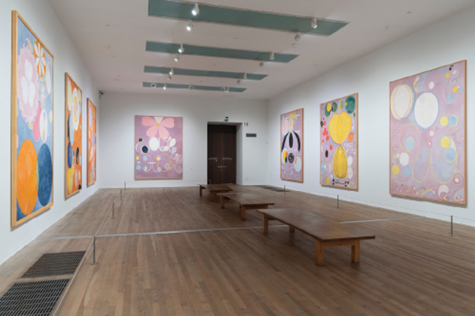 Sa pensée mystique triomphe dans la couleur. La dernière salle est entièrement consacrée à la série des dix grands tableaux (The Ten Largest) que l’artiste peint en 1907 sur des formats de plus de 3 mètres de haut. Cet ensemble exceptionnel, ici rassemblé, est réalisé pour son projet de temple (dont la maquette est montrée). Avec ces motifs floraux, ces formes en spirale qui s’engendrent les unes les autres pour évoquer l’évolution et la croissance, Hilma af Klint, guidée par des voix, offre une fresque éblouissante sur les différents âges de la vie. Baignée de bleus, de roses et d’oranges, cette farandole de couleurs et de formes explose et donne à voir une véritable épiphanie.