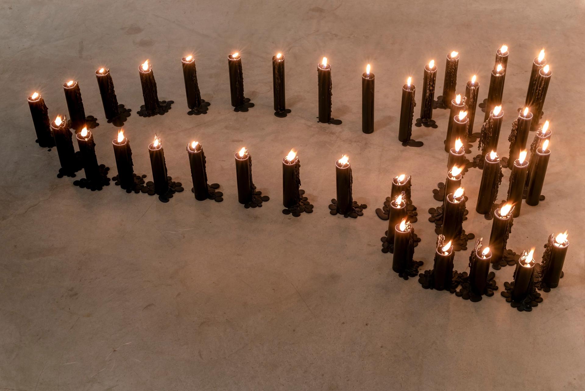 Mais, le corps ne constituera bientôt plus qu’une trace, une empreinte qu’elle forge dans la nature. L’œuvre devient tridimensionnelle, ce qui l’amène à réaliser des installations à l’extérieur, dont deux reconstituées ici, comme la spectaculaire forêt intitulée Enterrement Ñañigo (1976) ou la plus poétique Anima (1982), silhouette humaine formée d’une quinzaine de cristaux de roches noires déposés dans de l’herbe et faisant immanquablement songer à une sépulture rituelle ancestrale. Ce rapport étroit du corps à la nature s’apparente aussi à la pratique féministe d’artistes telles Nancy Spero (avec laquelle Ana Mendieta fonde AIR en 1972, la première galerie de femmes à New York) ou Howardena Pindell (exposée dans la même galerie), voir Gina Pane pour certaines de ses premières œuvres. Formellement parlant, on pense aussi à la célèbre œuvre de Giuseppe Penone Souffle de feuilles (1979), où l’artiste italien s’allonge sur un épais matelas de feuilles de buis, y laissant ensuite son empreinte.
