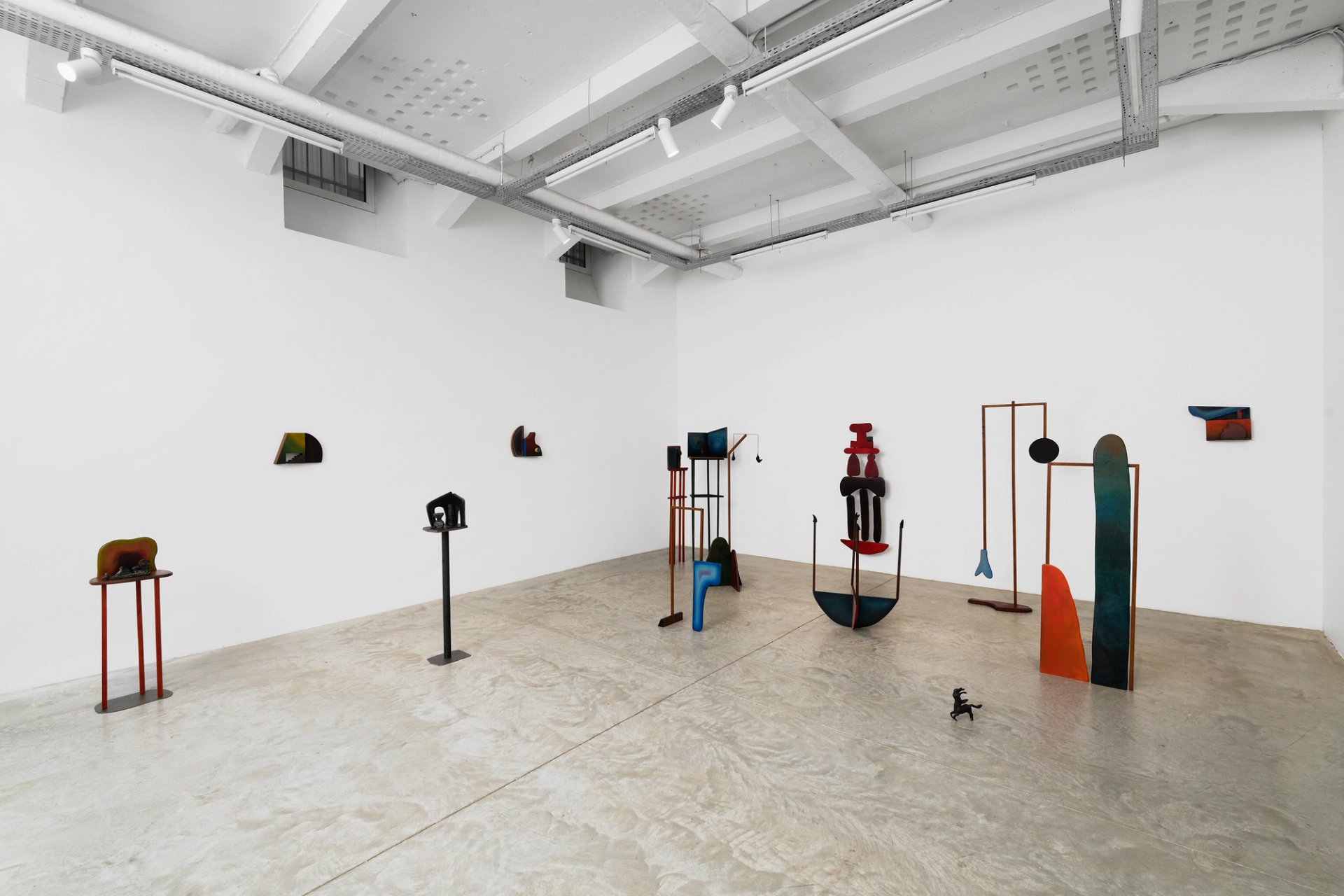De l’autre côté, en réponse, une autre composition murale en bois découpés dans des tons de jaune et une figure solaire. À côté d’elle, figurent des sculptures sur des socles, des découpes biomorphiques colorées portées par des structures en bois, mais aussi des décors de théâtre en format de maquette avec visage ou cheval en bronze. Une minuscule sculpture en bronze, du genre surréaliste, bouleverse, nous fait glisser du côté d’Alice. Des références visuelles viennent naturellement à l’esprit, de Fausto Melotti à Isamu Noguchi. En même temps qu’elle développe une démarche très actuelle avec, au centre, l’œuvre entendue comme accessoire de performances et comme support de fictions, Ana Mazzei choisit de se placer et de se déplacer dans l’histoire. Cette réunion de pièces dont l’abondance d’abord surprend, est une façon d’offrir un spectacle d’objets dans la tradition du théâtre, à l’encontre du modèle dit scénographique des expositions moderne. En ce sens, elle tient du manifeste et de l’allégorie.