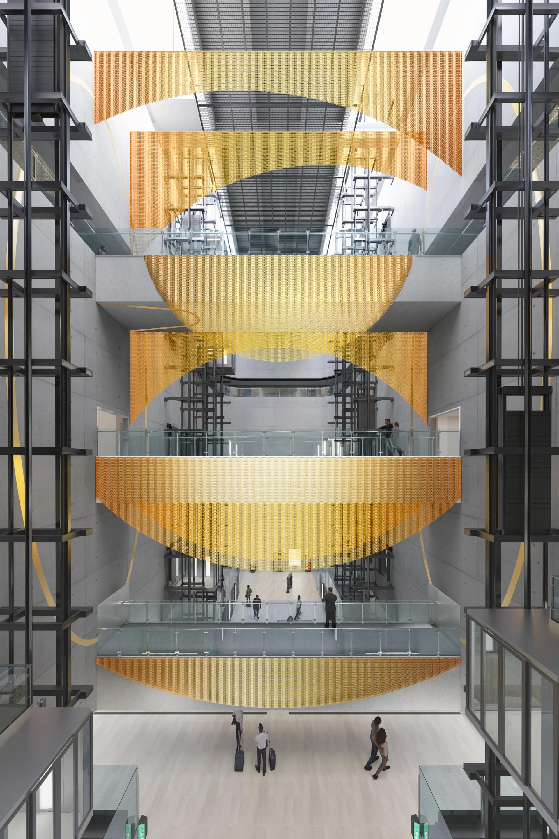 Kapwani Kiwanga a, quant à elle, disposé des rideaux métalliques dorés, suspendus aux passerelles de la gare de l’aéroport Charles de Gaulle, conçue par Daniel Jongtien. L’œuvre évoque « le pouvoir unificateur du Soleil qui rassemble tous les êtres sous un même astre. »