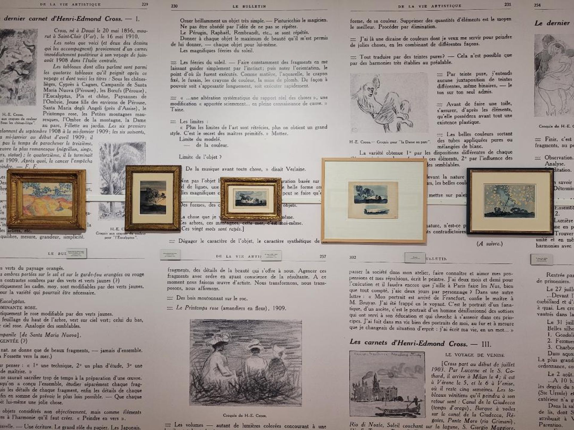 À quelques encablures, au Lavandou, Cross s’était lié avec le peintre Theo Van Rysselberghe et son épouse. C’est là que la municipalité a pu racheter l’ancien atelier de « Théo », le réaménager et en faire un centre d’art ouvert au public en 2017. Un cadre idéal et intimiste pour les travaux sur papier de Cross. Dans le hall, des photos retracent les amitiés de l’artiste avec ses visiteurs, dont le critique et poète Émile Verhaeren. Heureuse idée de scénographie : dans la première salle, les carnets de travail de l’artiste, avec ses notes et ses croquis, sont reproduits au mur, agrandis ; et dans la grande salle, même procédé mais cette fois avec des photos d’époque montrant l’atelier du peintre au Lavandou, au milieu des champs et d’un paysage encore bucolique…